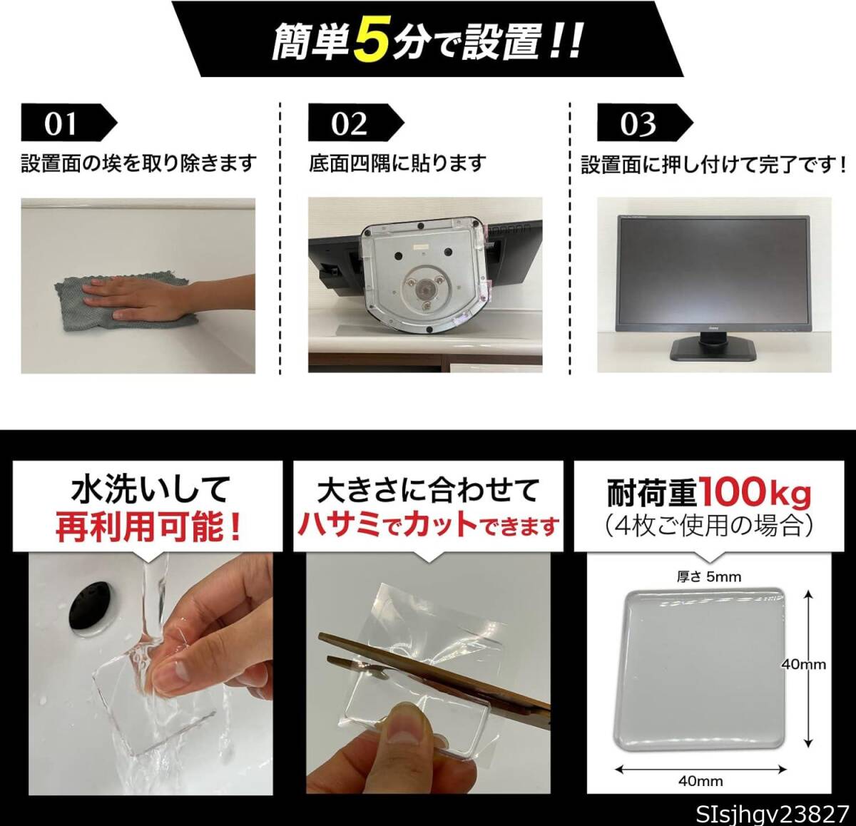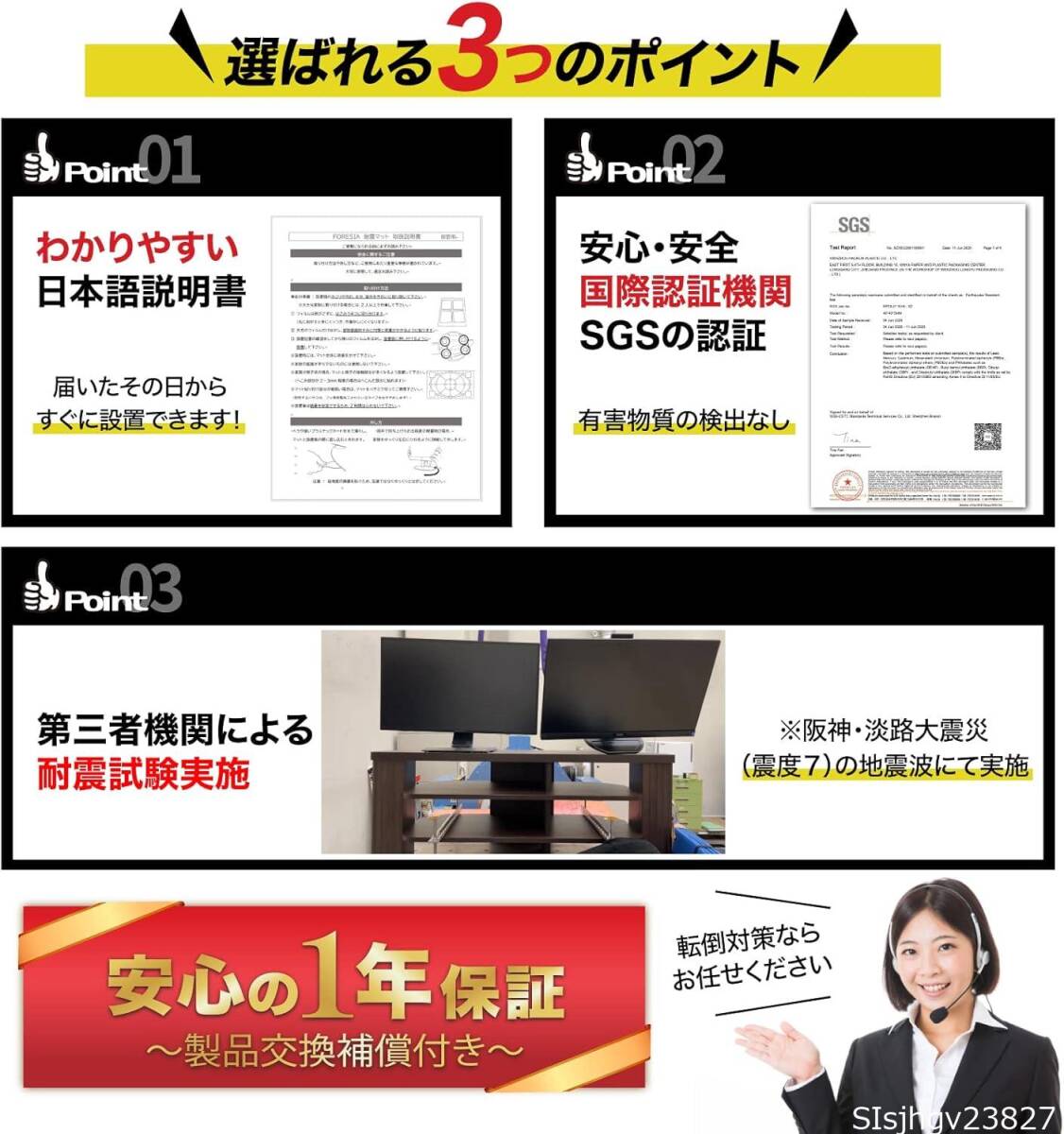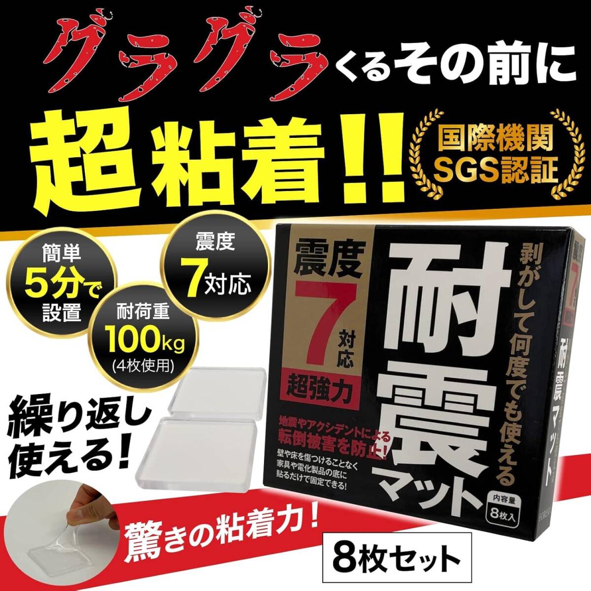 【新開発の耐震マット】驚異の粘着力により、貼るだけで転倒対策ができます。賃貸住宅で穴を開けられない場合でも、工事不要で設置することが可能です。厚さ5mmで耐荷重100kg(4枚ご使用時)の耐震ジェルです。子供やペットのいたずらによる、転倒防止にも役立ちます。