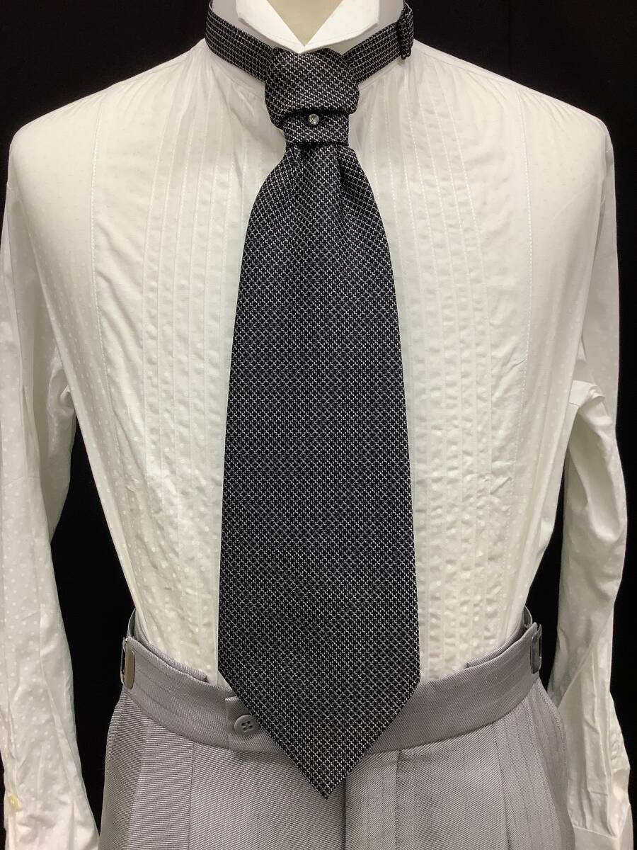 ベストと共生地のタイはワンタッチの着脱式、中央にジルコンピン
