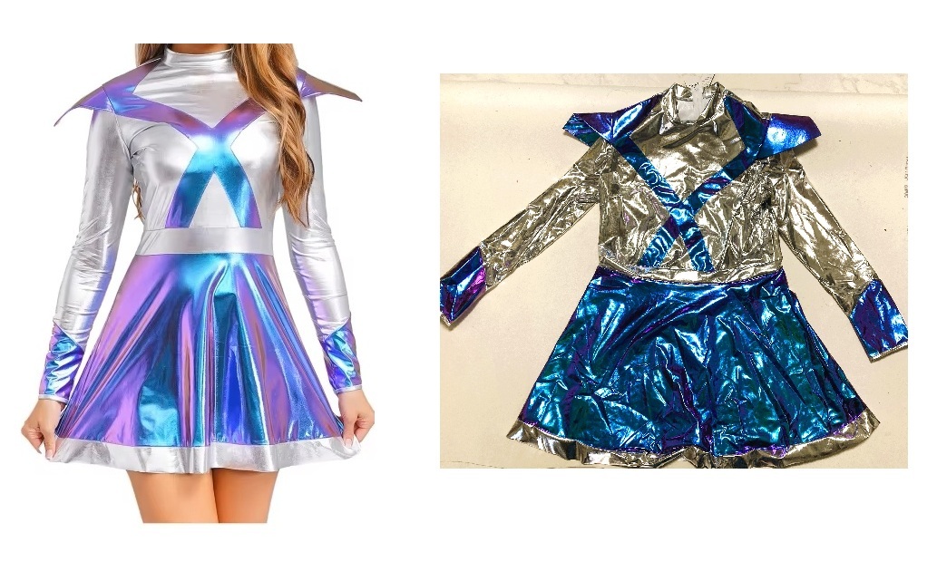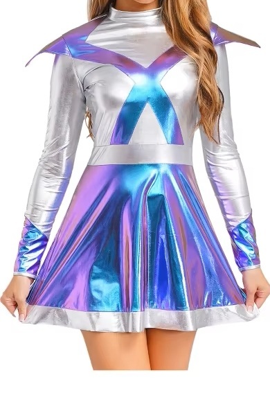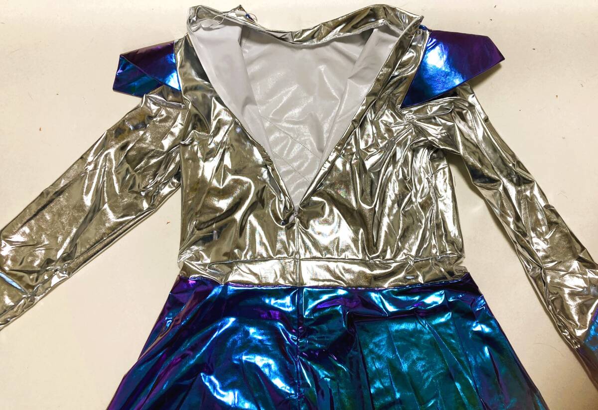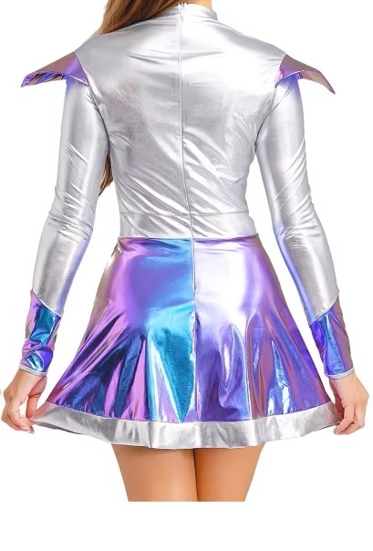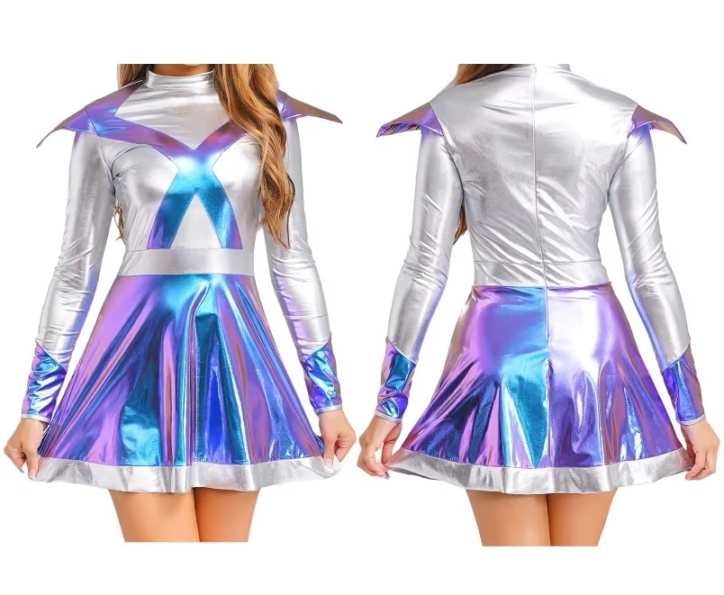 レディースエイリアン宇宙飛行士コスプレドレスメタリック光沢のあるAラインドレススペース女性戦士ドレスパーティーイベントコンペティションコスチューム