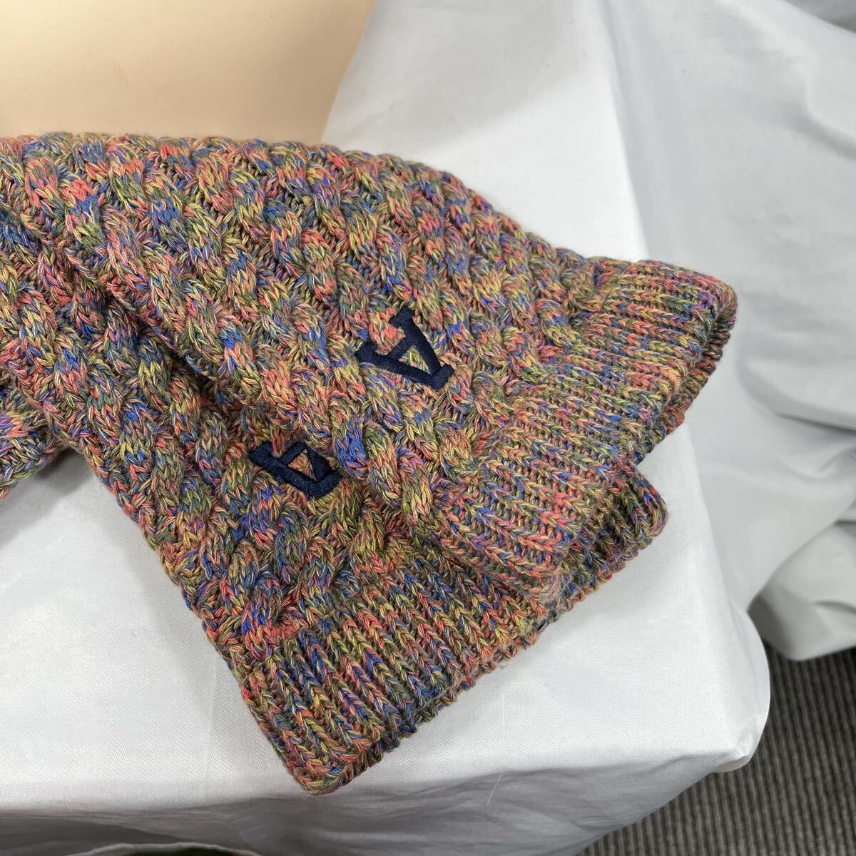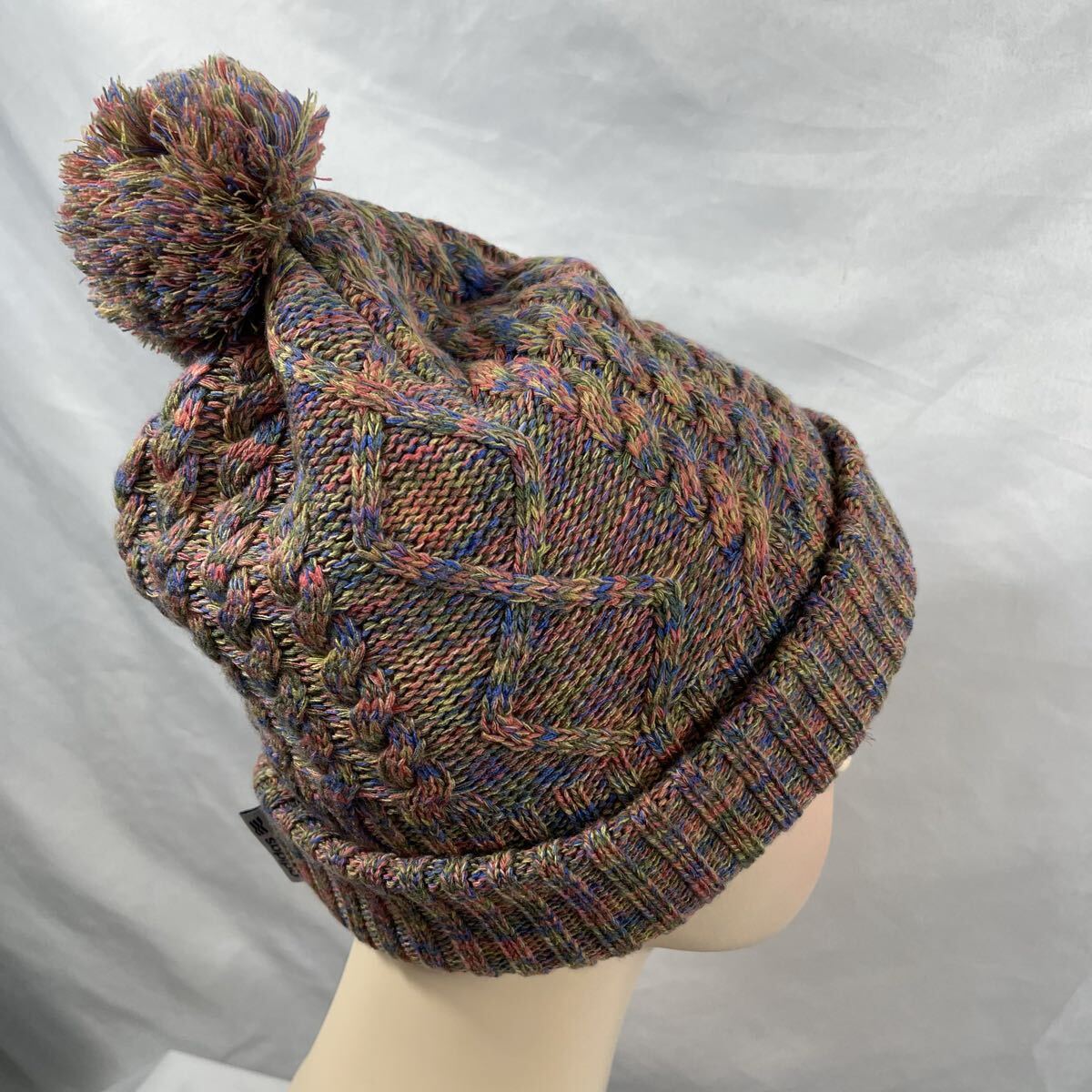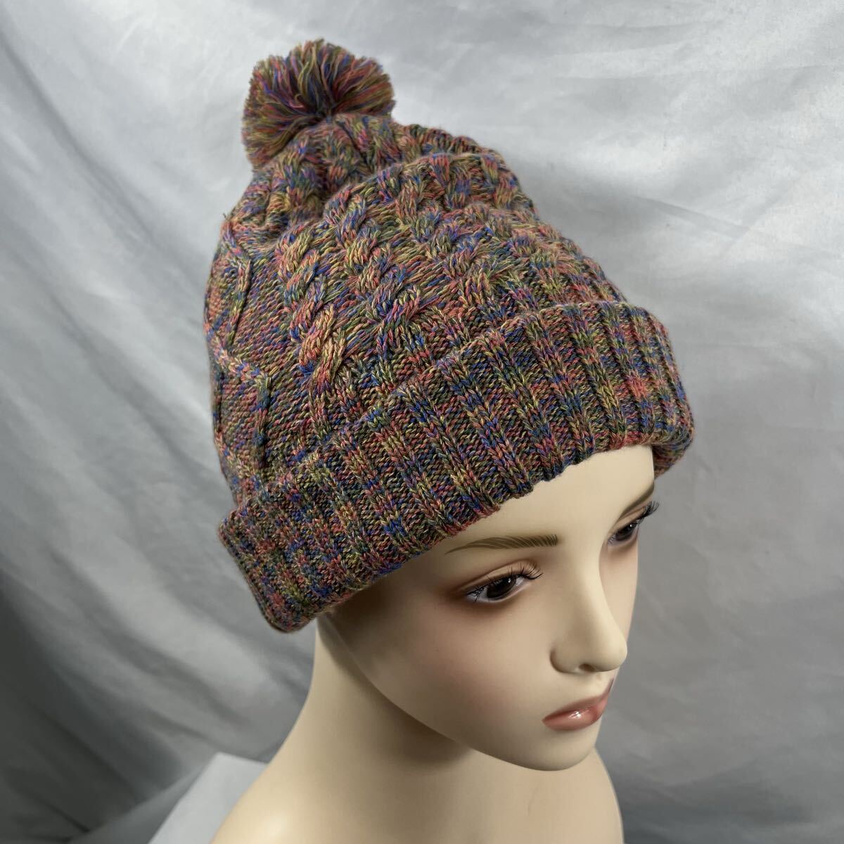 ・ポンポン付きのカラフルなケーブルニットビーニー。レッグウォーマー付き