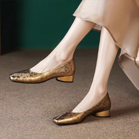 レディース レオパード柄 スクエアトゥ パンプス ローヒール チャンキーヒール 24.5cm(39) ゴールド