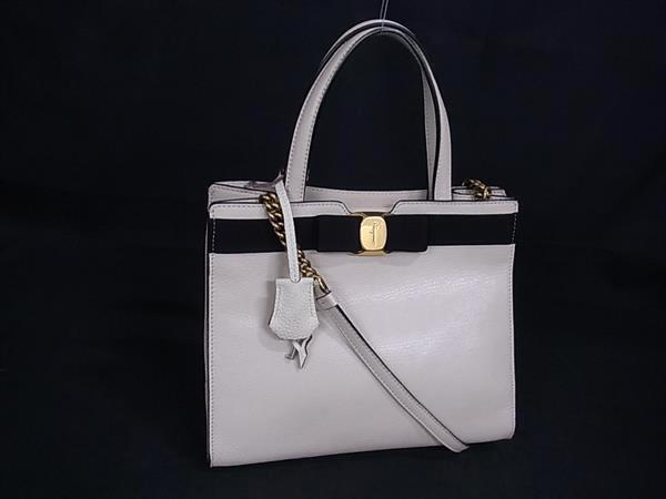 1円 Salvatore Ferragamo フェラガモ AU-21 1290 ヴァラリボン レザー クロスボディ ハンドバッグ トート ショルダー アイボリー系 FP5451