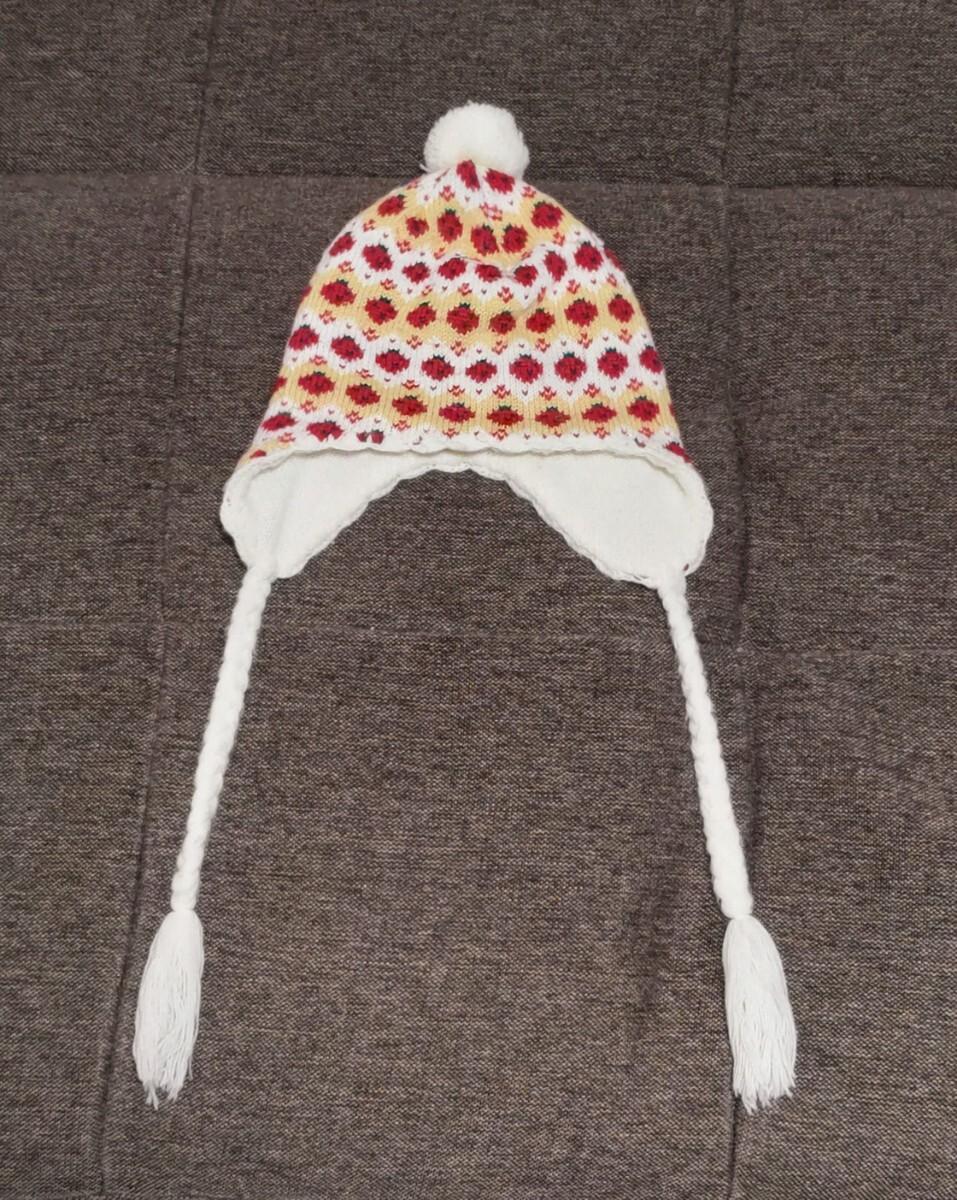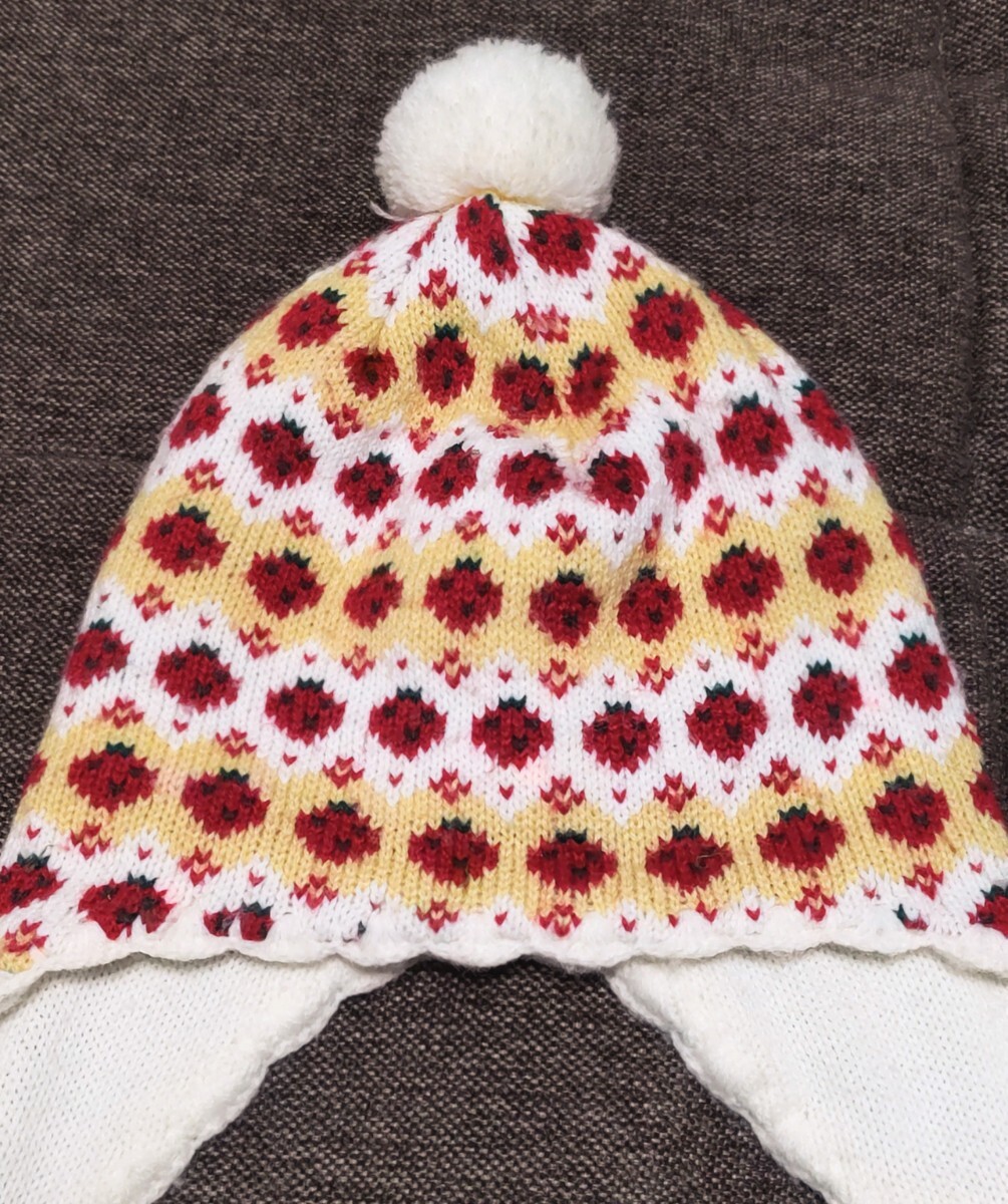 白 クリーム色ラインにイチゴ柄 両サイド三つ編み風 ボンボン付き