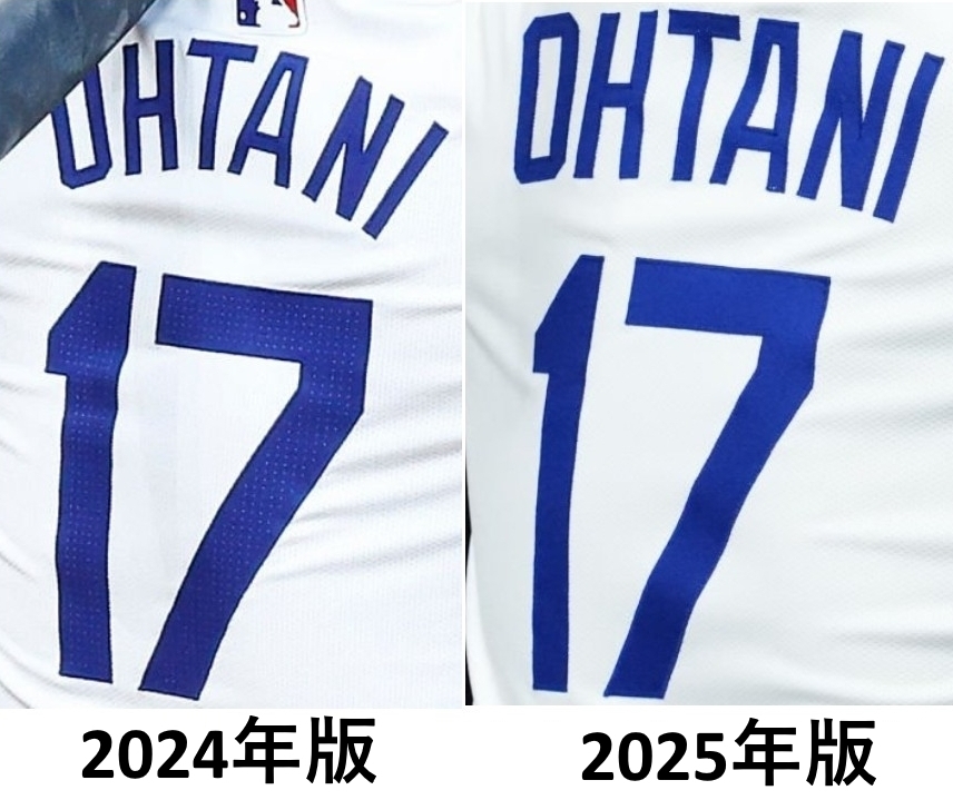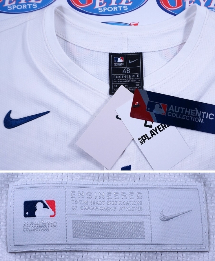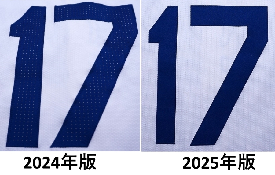 今回出品されているユニフォームはNIKEエリートの2025年バージョンです。大リーグのファンならご存じだと思いますが、2024年モデルのユニフォームは色々な理由で選手とファンから不評でした。今回のユニフォームは2024年の「改良版」で、去年のユニフォームと比べると生地も微妙に違い、番号/背名前なども一回り大きくて、番号にはVAPORの穴が入っておりません。更にオーセンティックタグも黒から白に変わりました。実物を手にとらないと分かりませんが、ユニフォームは去年のものと比べるとかなり高級感があります。