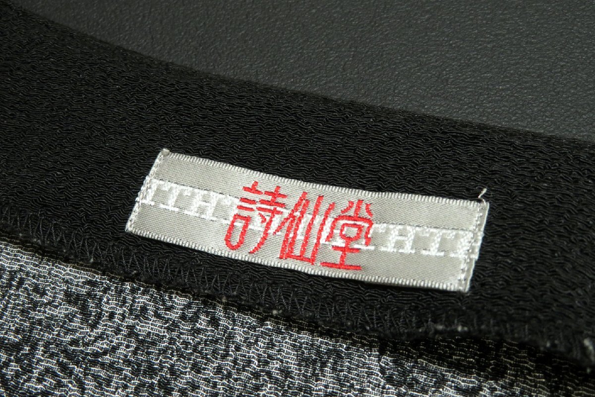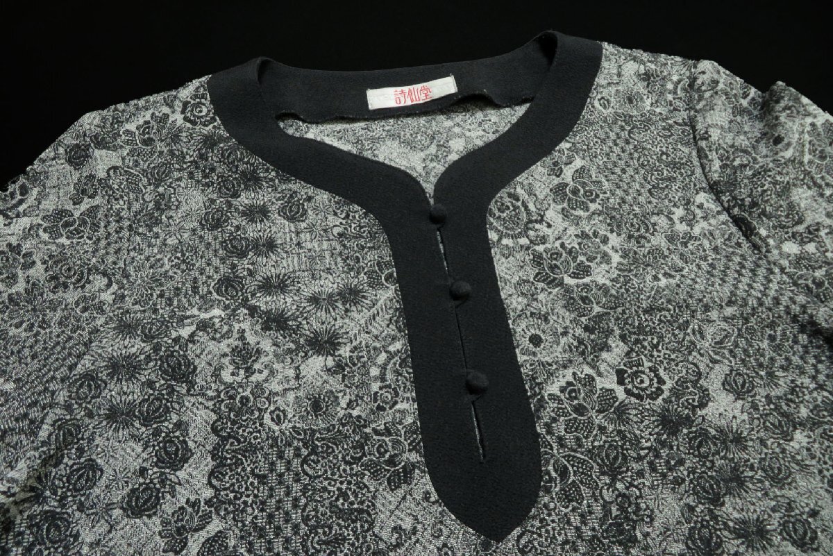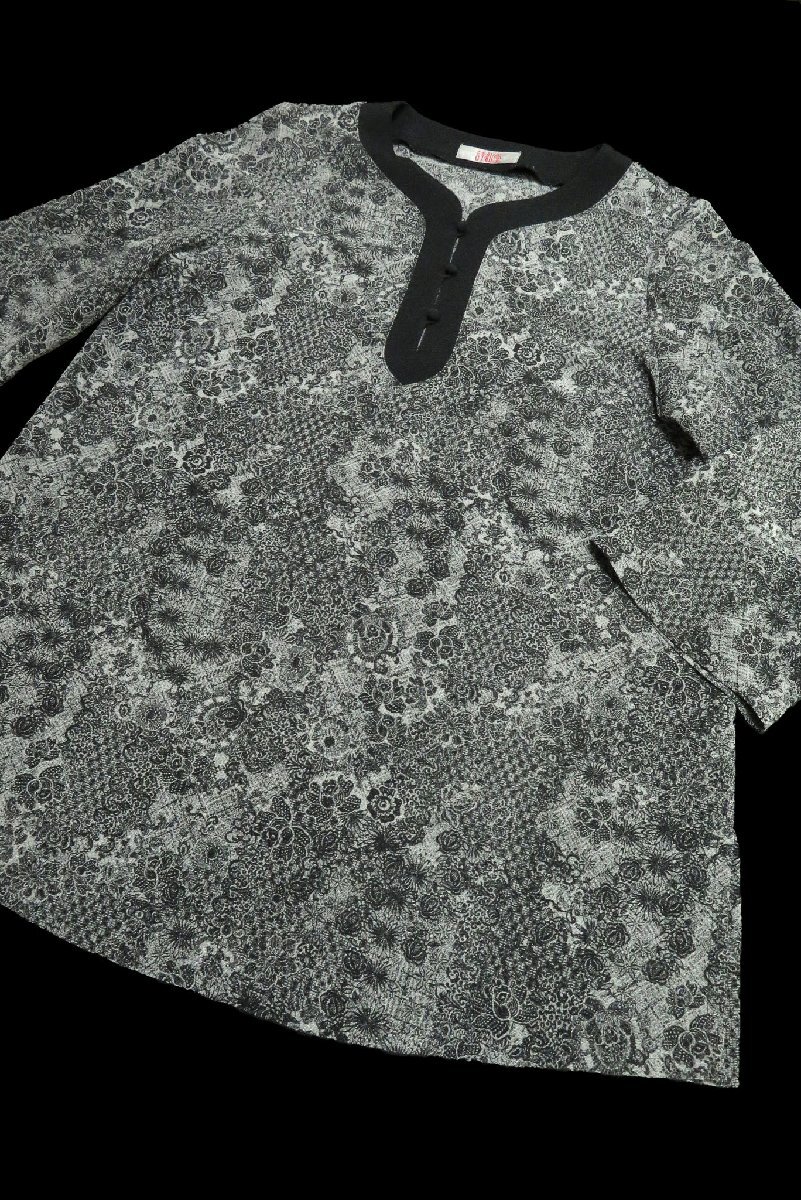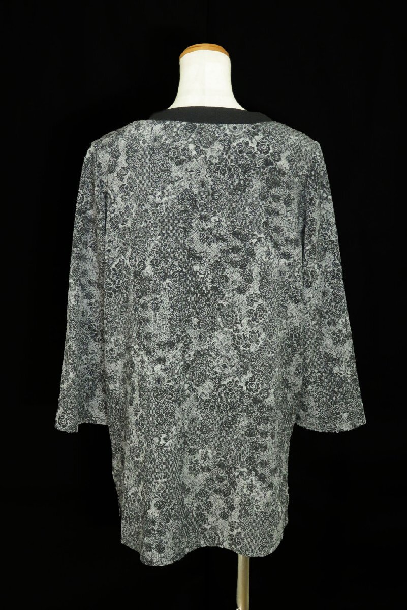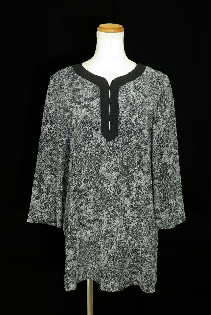 ☆美品☆詩仙堂/洗えるちりめん織りお花柄プリントハーフボタン長袖チュニック:灰黒nl890