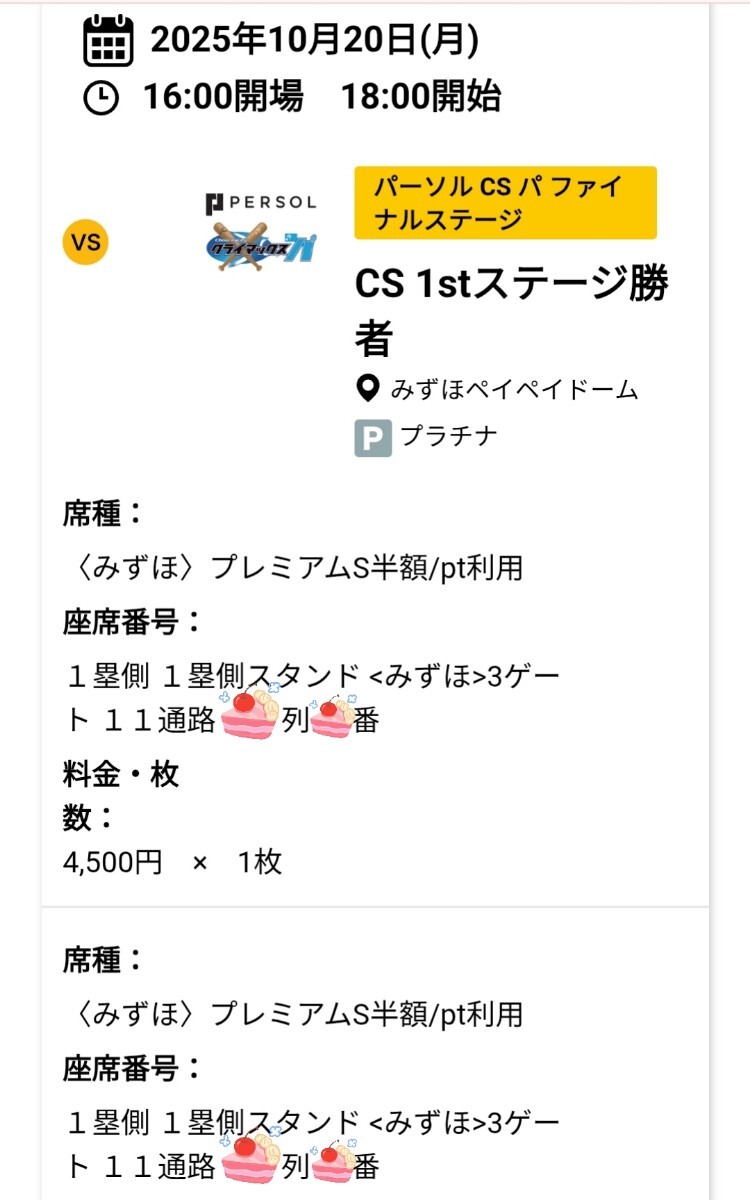バックネット裏から12列目ペアチケット★10月20日(月)ソフトバンクホークス対日本ハムファイターズorオリックスバファローズ 1塁側みずほプレミアムシートSペアチケット