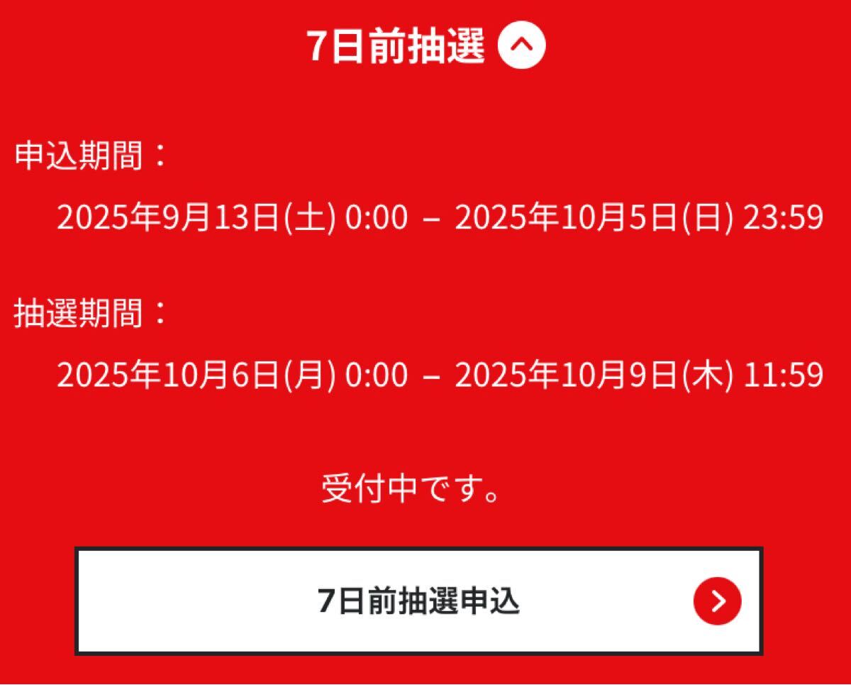 7日前抽選は未登録ですので、ご希望に応じて抽選にお申し込みください。