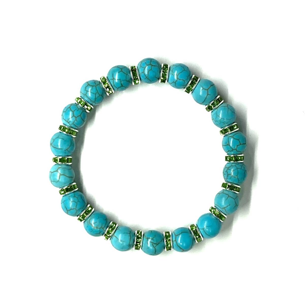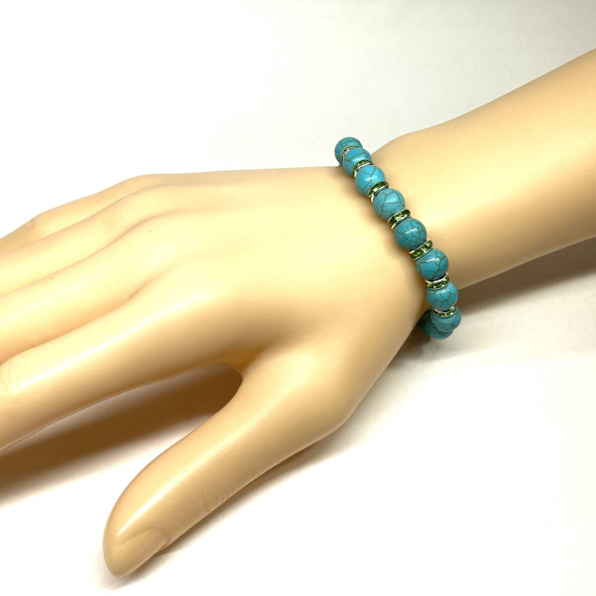 こちらは、ターコイズの8mm玉を使用したパワーストーンブレスレットです。石との間にはロンデルを挟み高級感を演出しております。シンプルなデザインは、シーン問わずどんなコーディネートとも合わせ易いブレスレットです。サイズは内径約15cmです。当社の中でも一番人気の実績があるデザインとなっております。気になる方はお早めにどうぞ。