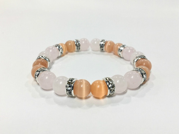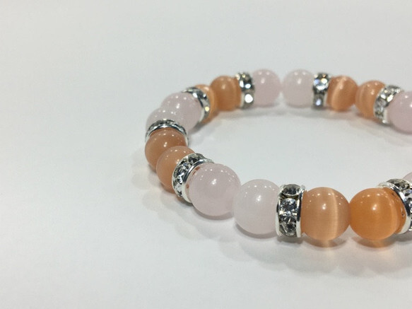 こちらは、8mm玉のキャッツアイとローズクォーツを使用したパワーストーンブレスレットです。間にはロンデルを挟み高級感ある大人っぽいデザインに仕上がっています。サイズは内周約15cmです。気になる方は是非この機会にどうぞ。
