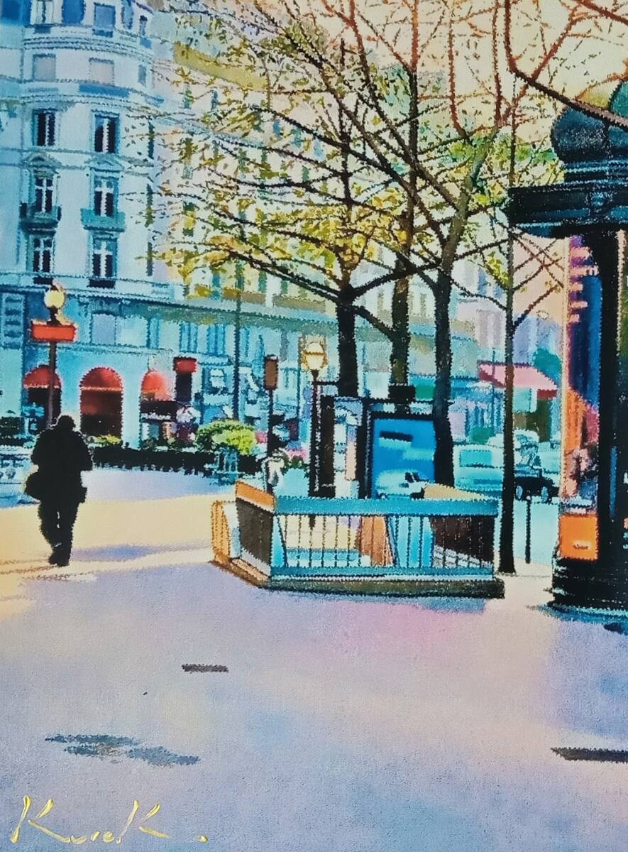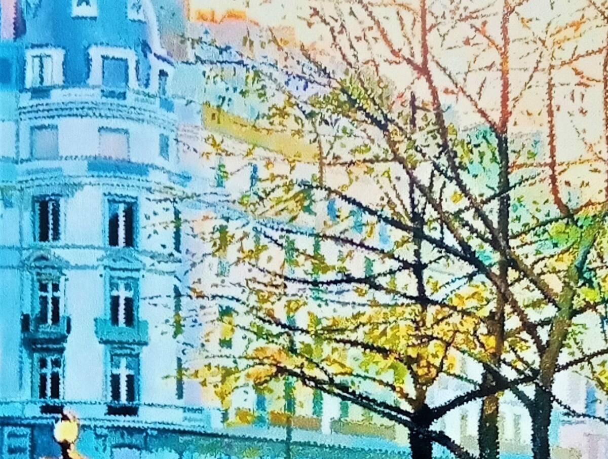 古い街並みに心惹かれると語る日下部和俊。人々の織成すドラマが小さな路地の隅々にまで感じられるパリやヴェネツイアは、特に好むモチーフとして多く描いてきました。彼の地の空気さえもが感じられると評される日下部和俊の作品ですが、見えるものをそのままに描いている訳ではありません。日下部和俊の心が捉えた街の表情を丹念に色彩で紡ぎ、表現しているのです。そして画法は失敗の許されない点描技法の為、完成した姿を描く前にしっかりとイメージし、集中してキャンバスに向かいます。10号(53センチ×45.5センチ)程の作品の制作に100時間、大きな作品になると300時間を要することもあります。美しく味わい深い色彩で描き出された作品の数々。その光と影には、過去から現在に至るまでそこで繰り広げられたであろう人々の喜怒哀楽までもが、見事に表現されているようです。