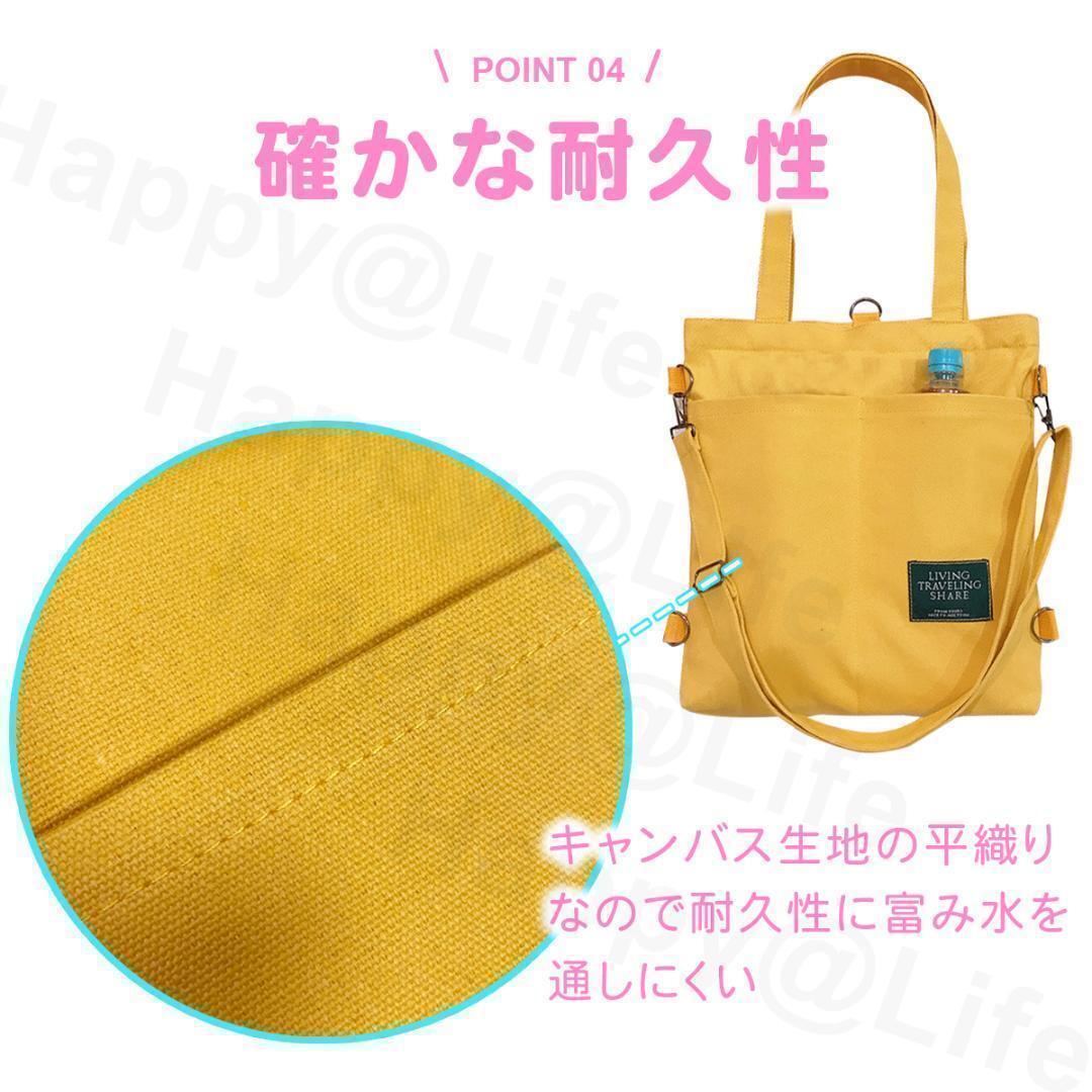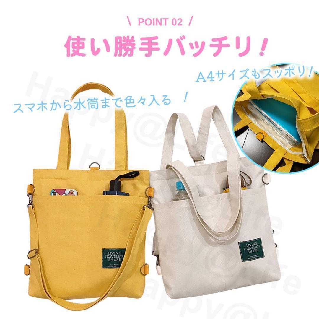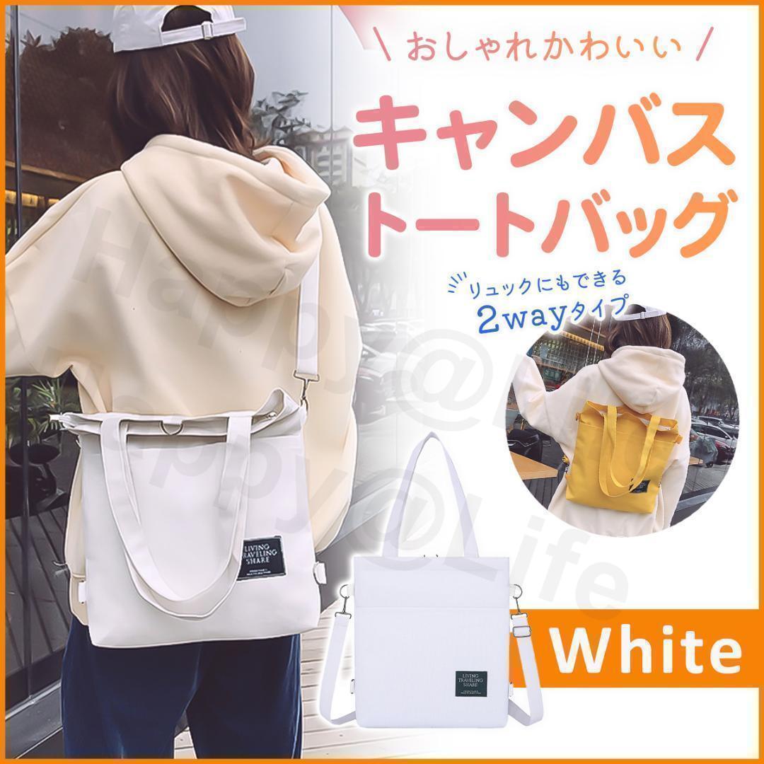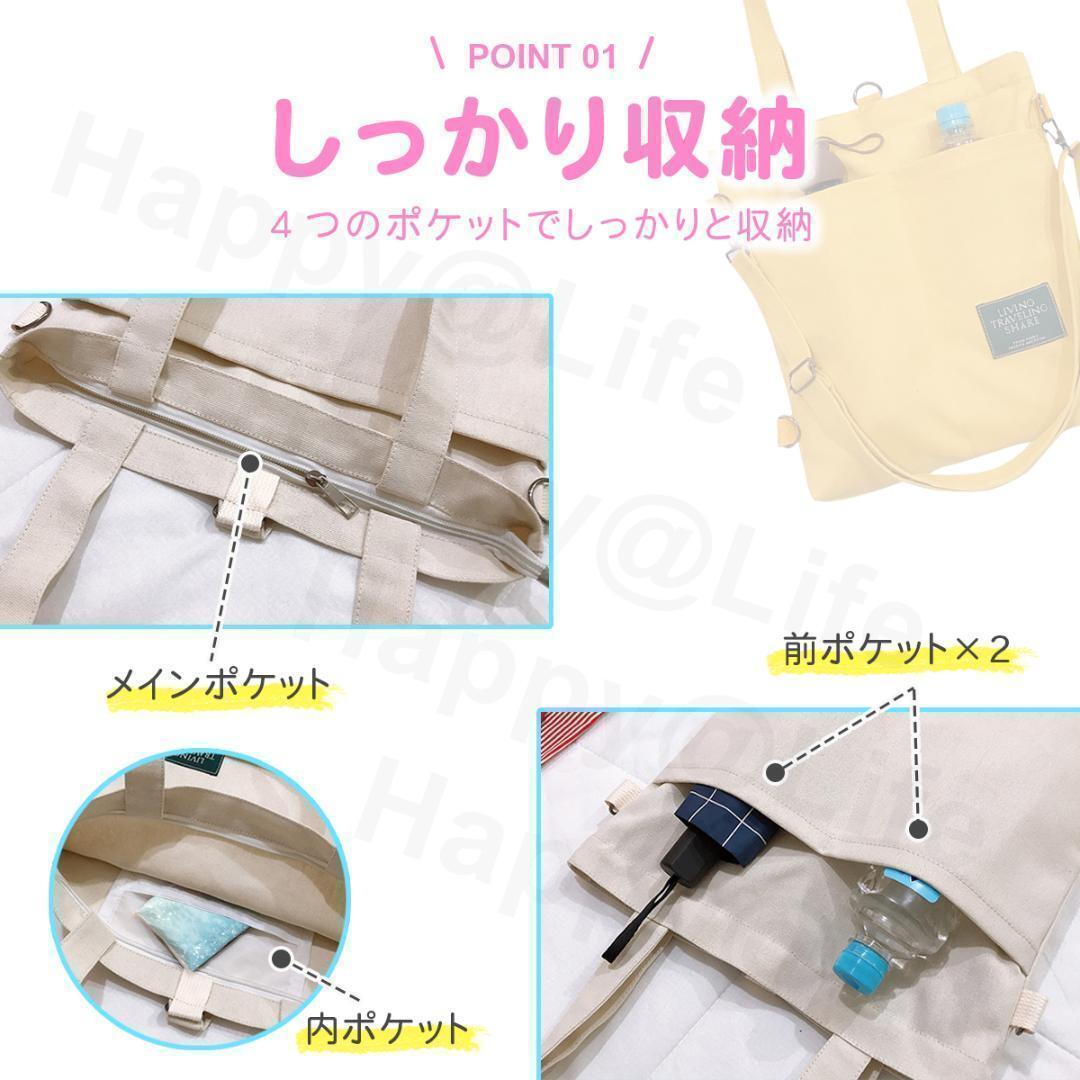 ホワイトのキャンバストートバッグ、A4サイズ対応で4つのポケット付き、2wayタイプで便利。