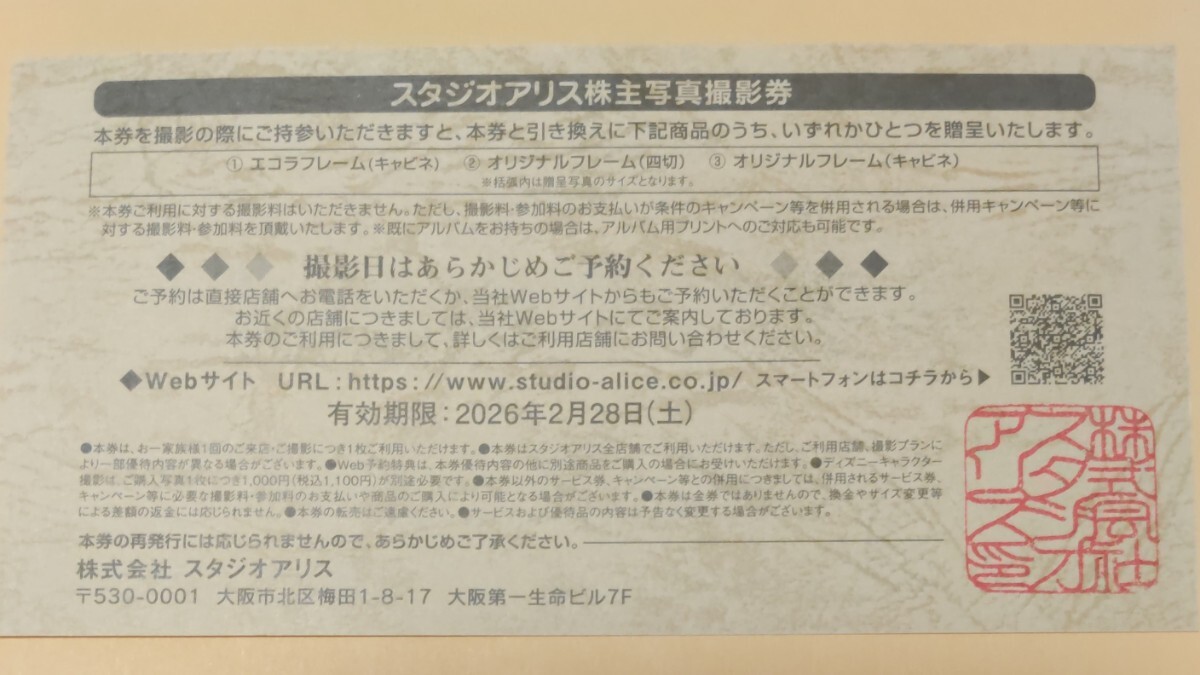 本券ご持参で写真撮影代が無料になり、下記商品のうち、いずれかひとつが贈呈されます。