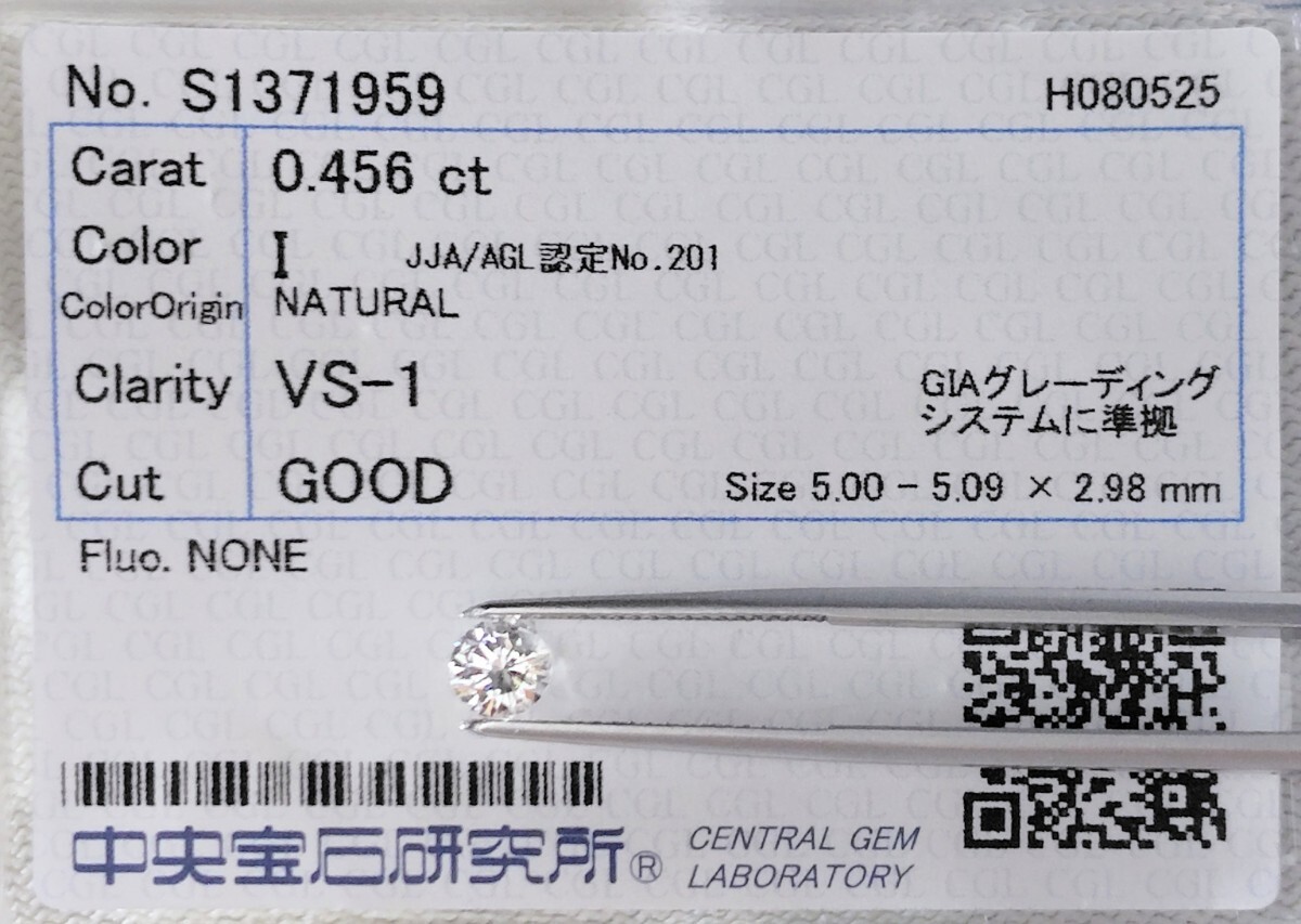 【10/4★安値〜】天然ダイヤモンド ルース 0.456ct I VS1 鑑別 CGL│A10654bg 【0.4ct】 ダイヤ diamond