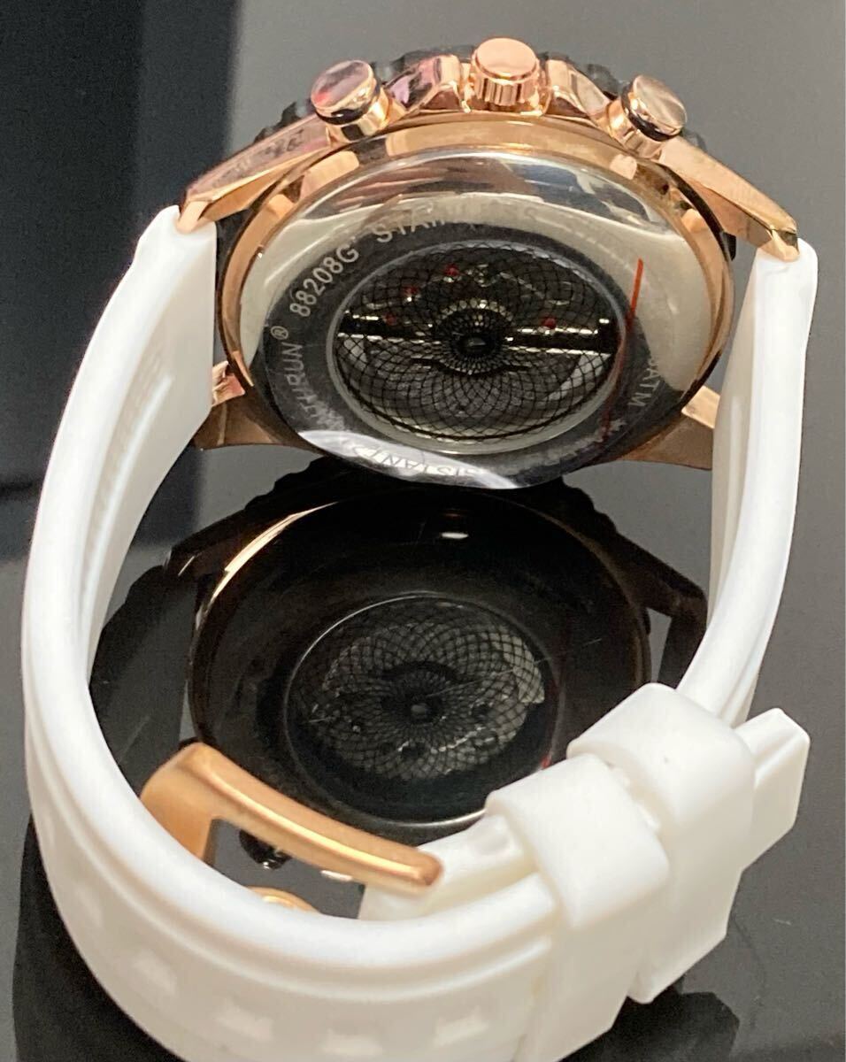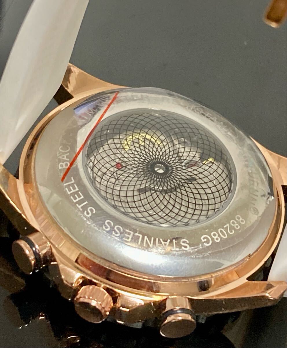 ケース裏は機械式デザインとなっており内部が遠心力でクルクルと音が出て回るモデルとなっております
