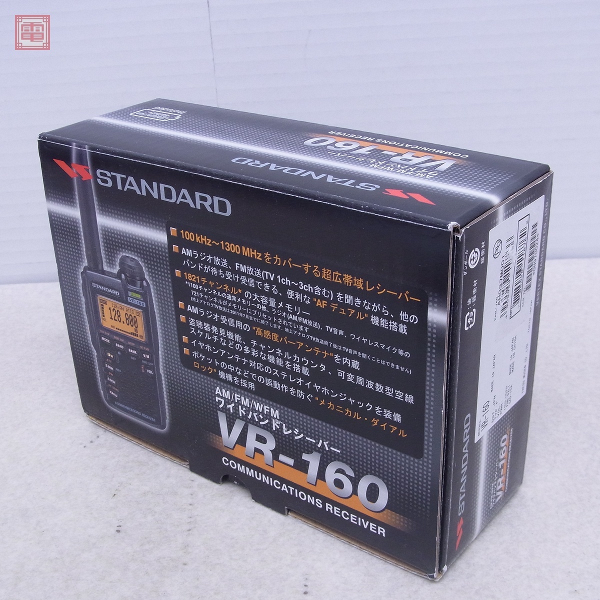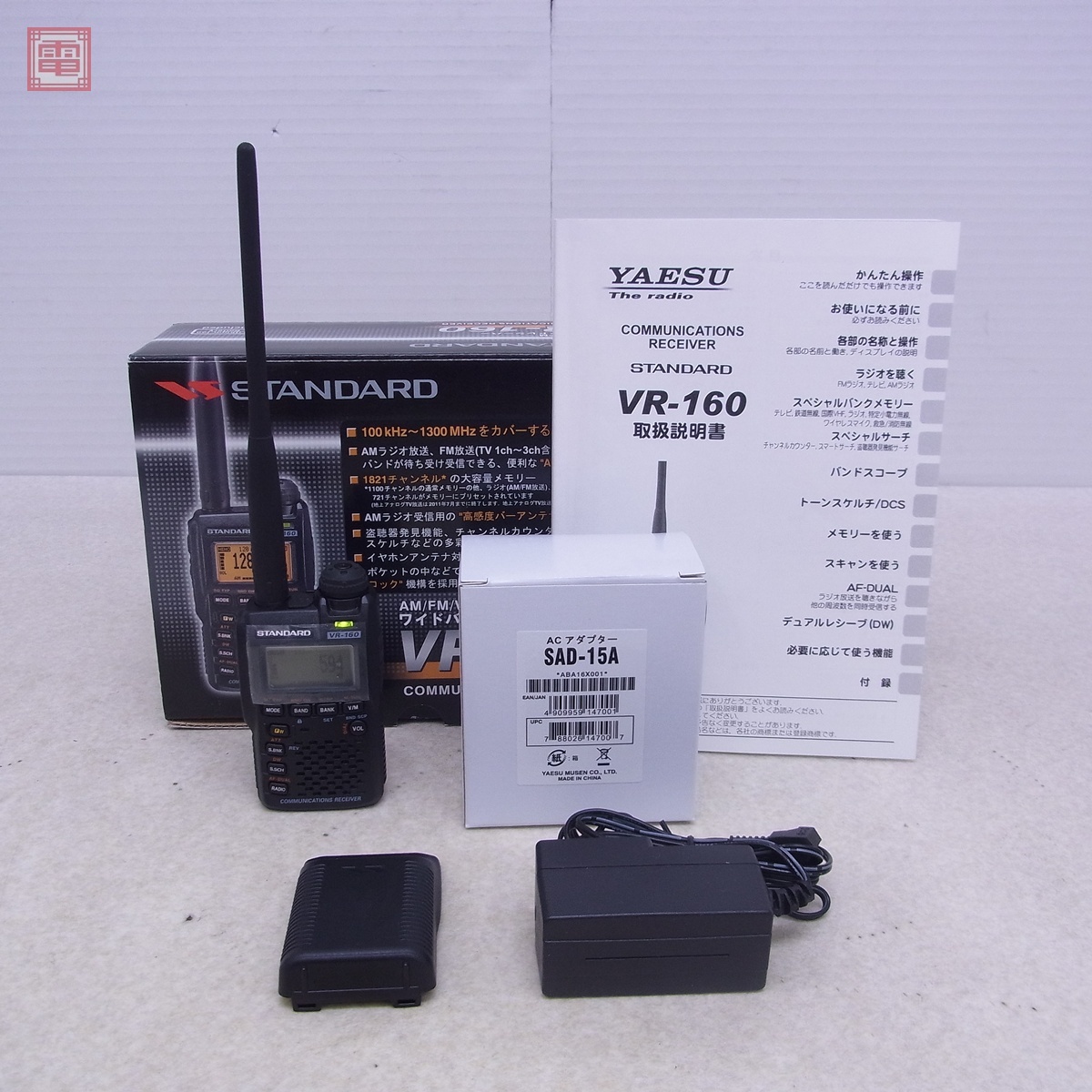ヤエス VR-160 ハンディ受信機 100kHz〜1300MHz 充電器・取説・元箱付 八重洲 スタンダード STANDARD ■<出品物> ・本体 ・リチウムイオンバッテリー(FNB-82LI) ・ACアダプタ(SAD-15A) ・乾電池ケース(FBA-37) ・純正アンテナ ・取扱説明書 ・元箱 ■<受信について> ・JST16時台にて下記の音声を確認出来ました。 【AM】 ★594kHz(NHK第1) ★693kHz(NHK第2) ★954kHz(TBS) ★1134kHz(文化放送) ★1242kHz(ニッポン放送) 【SW】 ★6.055/6.115MHz(ラジオNIKKEI) 【FM】 ★79.5MHz(埼玉NACK5) ★80.0MHz(TOKYO FM) ★82.5MHz(NHK FM) ★90.5MHz(TBS補完) ★51/144/430/1200MHz(アマチュア無線) 【AIR】 ★120.5MHz(航空無線) ■<状態> ・リセット動作は行っておりません。 ・ボリュームにガリはありません。 ・外観等の詳細は写真にてご確認ください。 ・タバコ臭はありません。 ■写真のものが全てです。付属物の有無や状態については写真からご判断ください。 ■付属物については細かいチェックはしておりませんので、万が一、欠品があったり余計な物が入っていたとしてもご了承ください。 ■商品到着後、当店の保証期間中は、商品及び箱や取説、付属品などを1つでも廃棄や破損をしないようにお願い致します。廃棄や破損をした場合、商品に問題があった場合でも対応や返金などの対処ができなくなります。 ■商品によりますが、発売されてから10年以上経過している中古品である事をご理解頂いた上でご入札をお願い致します。なお、新品や美品、また特記事項がある場合は別途明記します。 | |||
