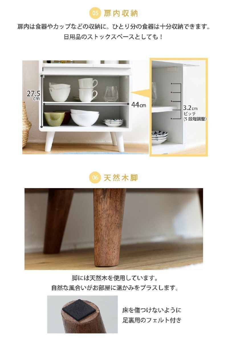 | ■商品説明 収納するものから設計されたデザインだから、コンパクトでも機能的。調味料やお皿、カトラリーなどを収納できる食器棚。食卓に必要なものをまとめて収納することができます。丸みのある北欧風のデザインはとてもおしゃれで、ひとり暮らしのお部屋にもぴったりです。 |