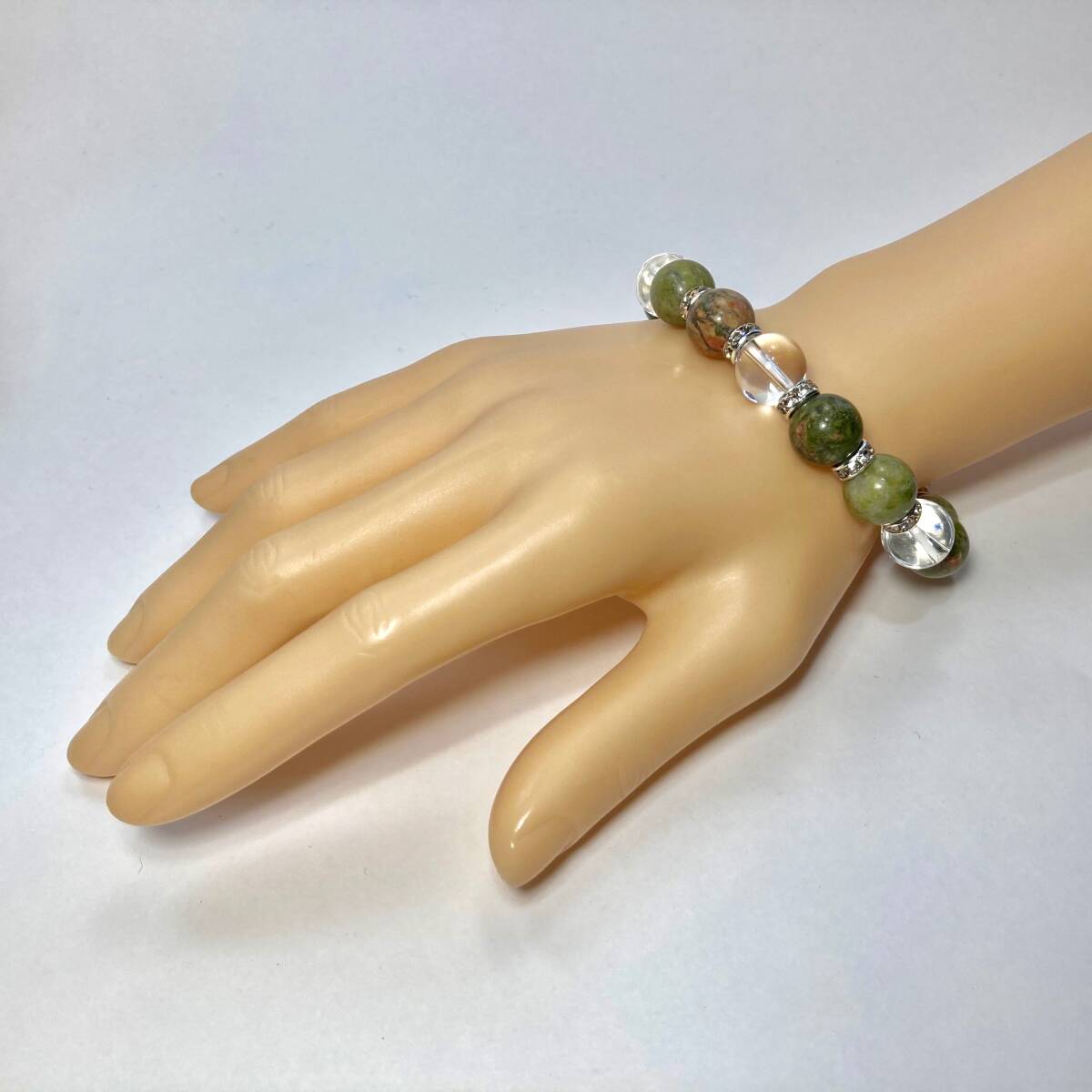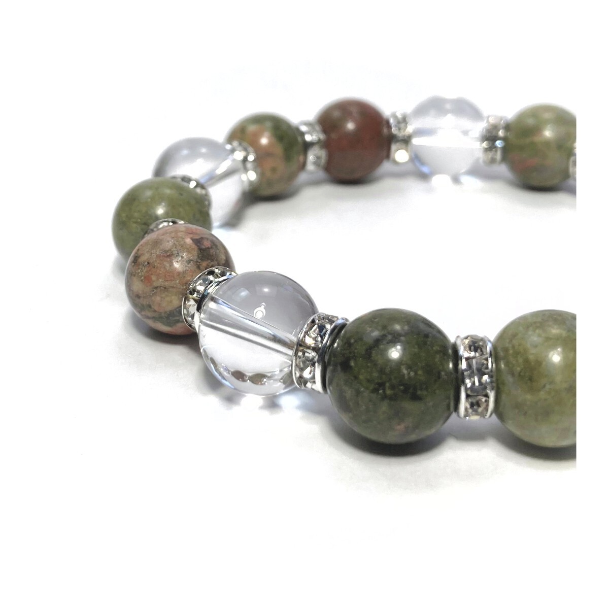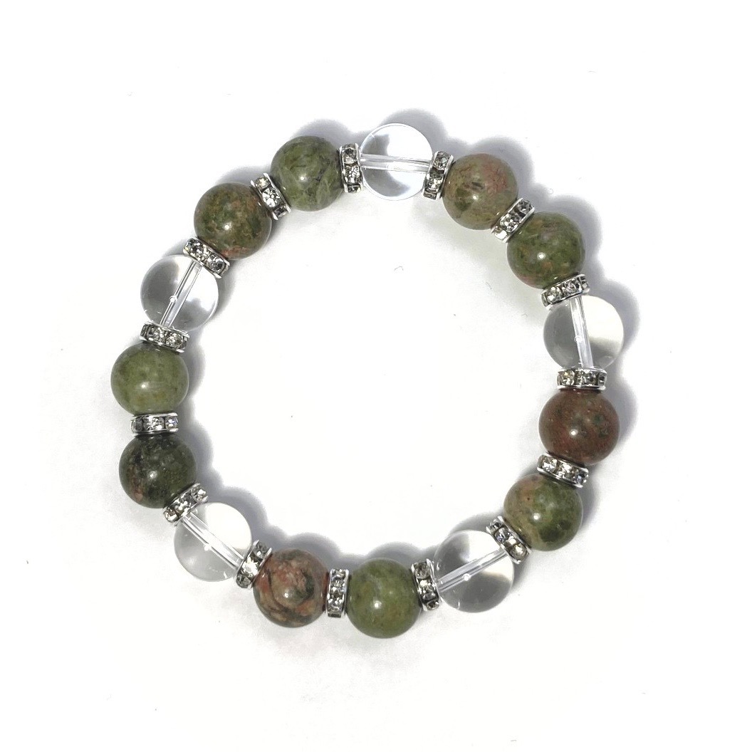 こちらは、ユナカイトと水晶を組み合わせたパワーストーンブレスレットです。間にはロンデルを挟み高級感あるデザインに仕上げております。石大きさは12mm玉を使用して内径約18cmです。気になる方は是非この機会にどうぞ。