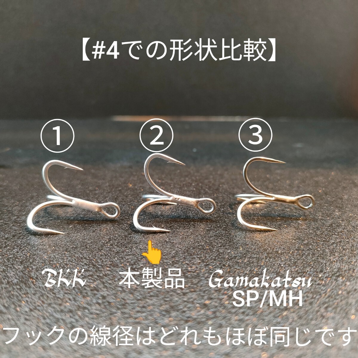 形状はO社のST46やG社のSP/MH、BKK製のフックに似ており線径もほぼ同じだと思います(手持ちのBKK製のフックと混ぜると見分けが殆どつきません。※主観になりますので画像でご判断お願い致します)