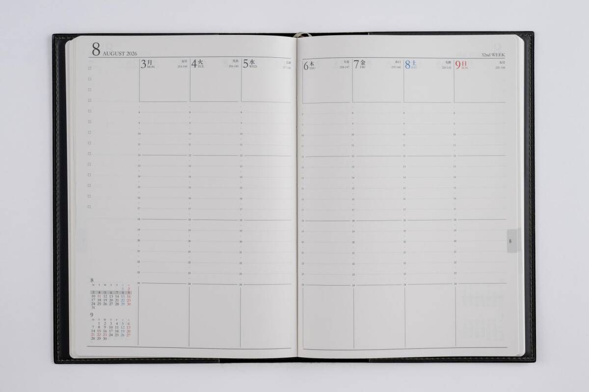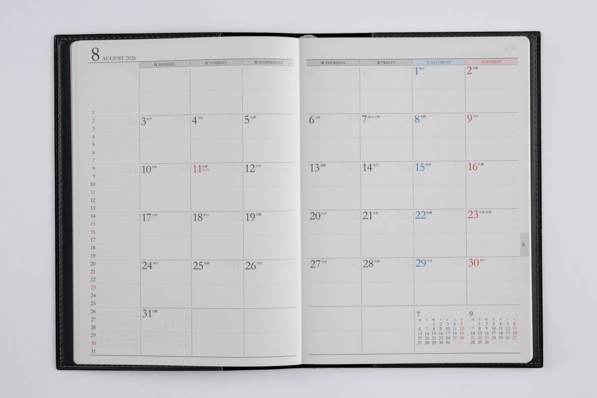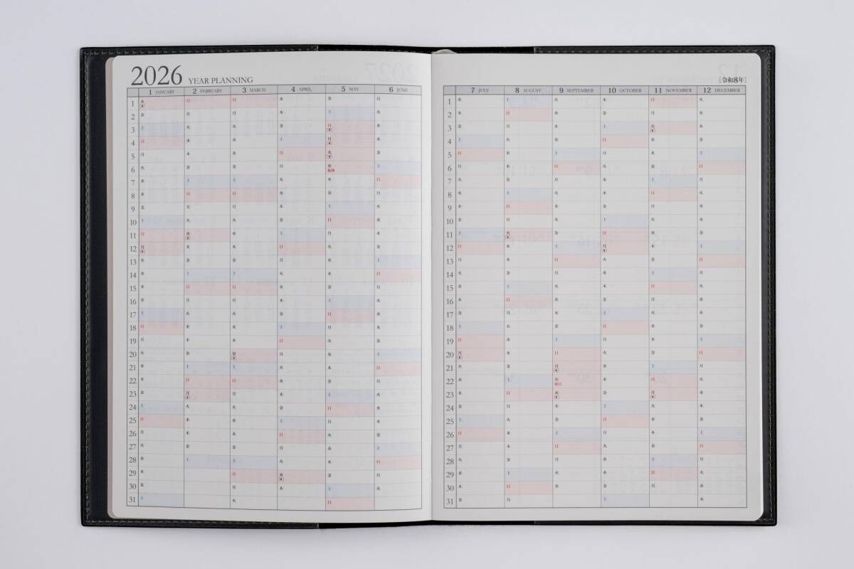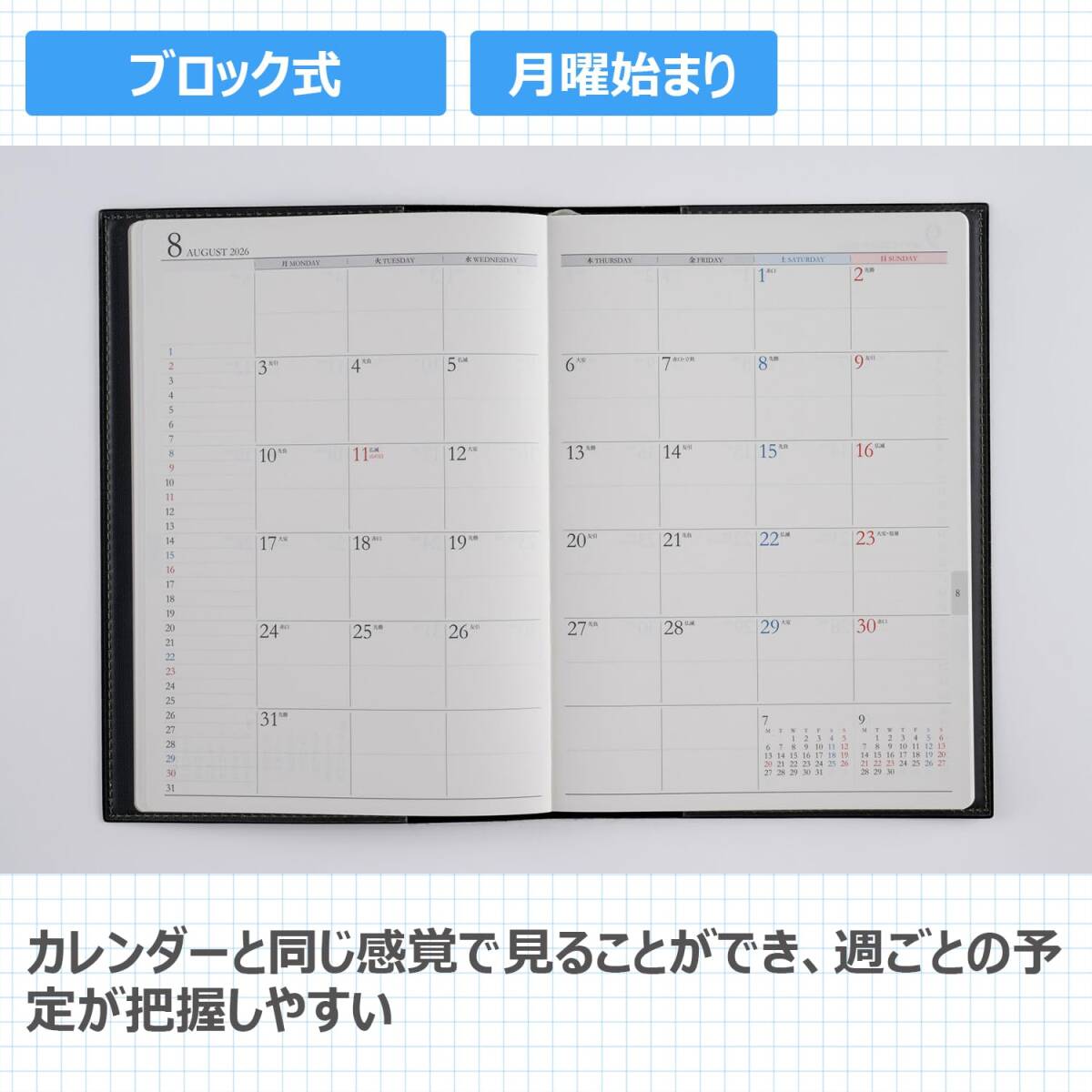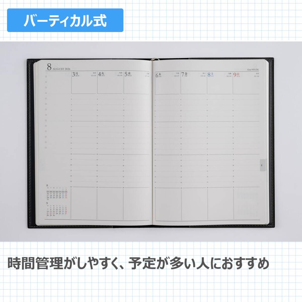 【月間予定欄:ブロックタイプ】スッキリとしたレイアウトが使いやすいブロック式。左側には横ケイ式カレンダーも付いているので、長期にわたる予定も管理しやすいです。  <BR>【週間予定欄:バーティカル式】バーティカル式は時間管理がしやすいレイアウト。空き時間が視覚的にわかるので、無駄な動きを減らせます。忙しい人にもおススメです。