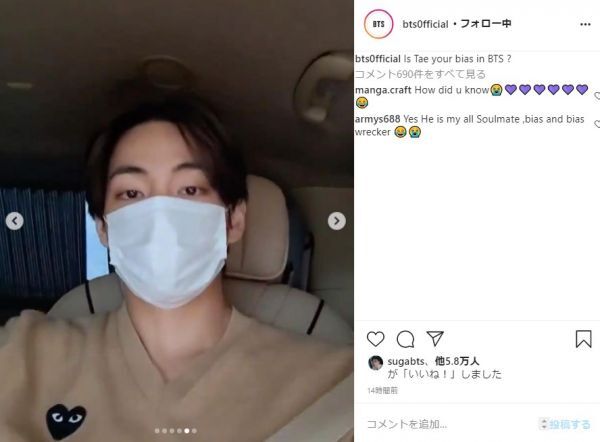 新品の BTS V-ブイ-着用!! プレイ コムデギャルソン 黒ハート Vネックニット・セーター(ベージュ) です。