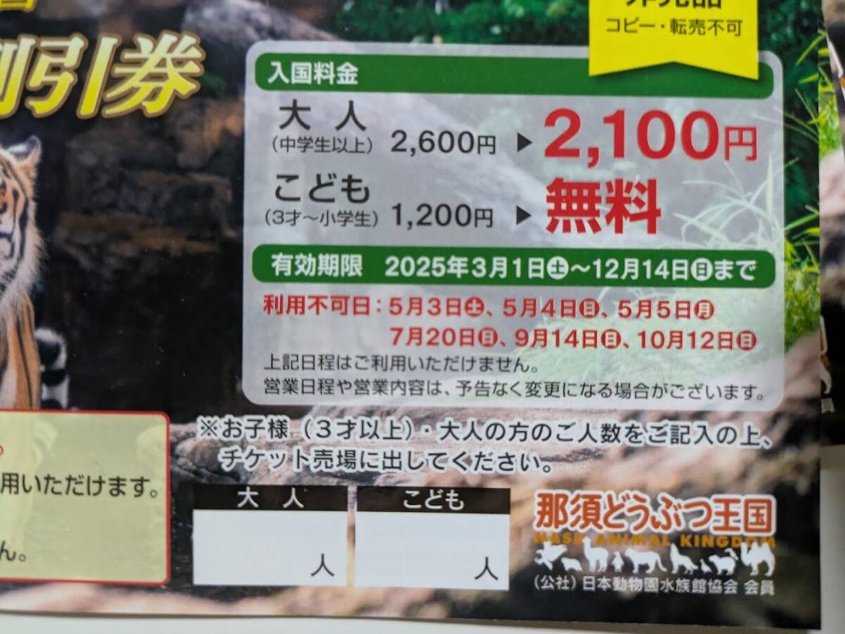 那須どうぶつ王国のプレミアム割引券、2025年12月14日まで有効。