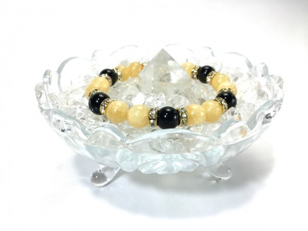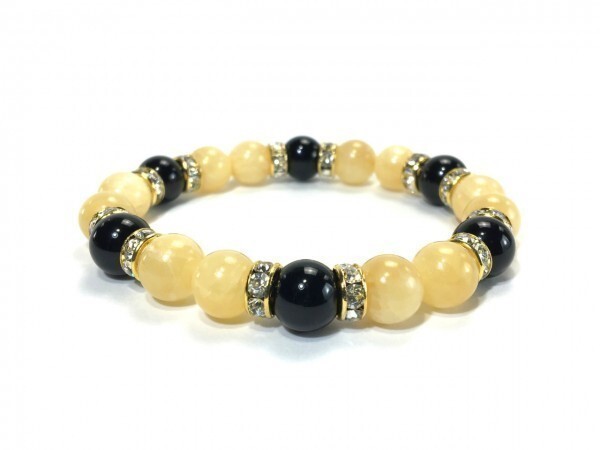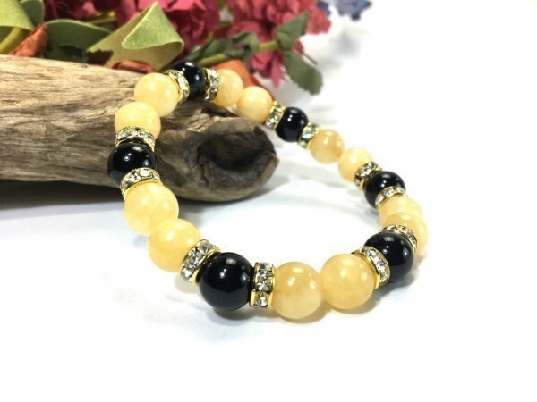 こちらは、アラゴナイトとオニキスを組み合わせたブレスレットです。間にはロンデルを挟み高級感あるデザインに仕上がっています。石大きさは腕にも馴染みやすいように10mm玉で内径約18cm(伸可能)です。数に限りがございますので気になる方はお早めにどうぞ。サイズ調節も可能ですのでサイズ調節の場合は取引ナビにてご一報くださいませ。(サイズ調節無料です)