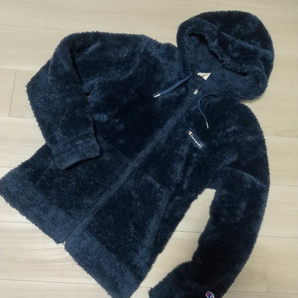 フロントはフルジップ仕様、両サイドにポケット付き。フードのドローコードや袖のチャンピオンロゴ刺繍がアクセントになっています。