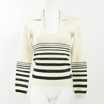 | アクリルウールニット素材で着心地柔らか♪ 衿部分はリブ編みでクラシカルな雰囲気が漂うから、 カジュアルなアイテムと組み合わせてもきちんとした印象に★ オフホワイト地にゴールドラメブレンドの黒が映える ボーダーデザインでクールにも着ていただけます☆ 美しいUネックがインナーとの組み合わせを楽しませてくれますよ◎ 着丈約55cm袖丈約59cm肩幅約37cmバスト約70cm 【サイズ】:(I40) 【素 材】:(ウール50% ポリエステル50% ) 【 色 】:(オフ白、黒) 【程 度】:(A) 20110928-001 211 021 | ||||