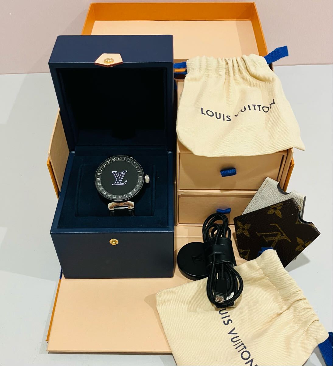 ●付属品 純正BOX、取り扱い説明書、ICチップカード、製品規格冊子、充電キット、クロシェット×2、ロゴ入りクロス、巾着袋×2、ロゴ入りクロス