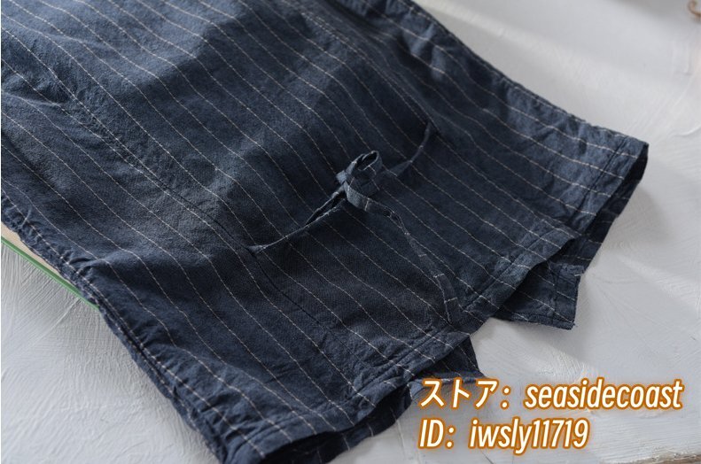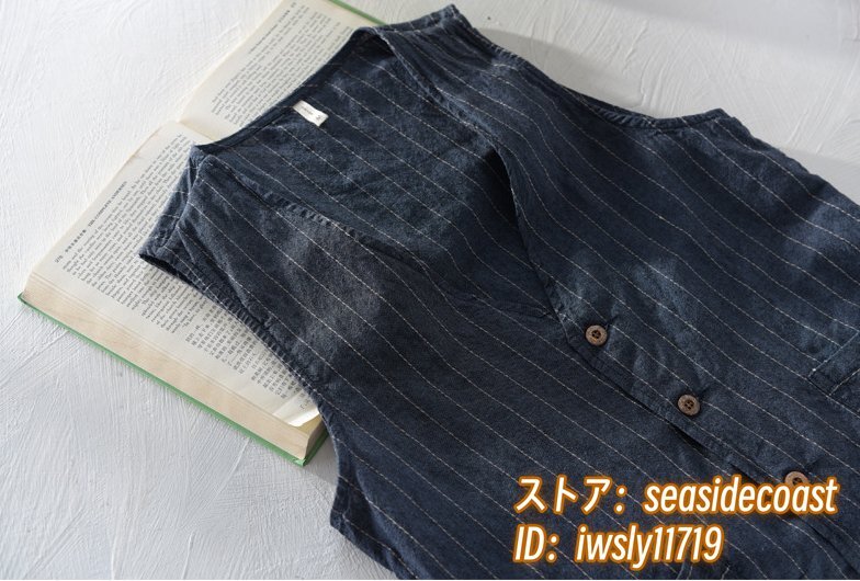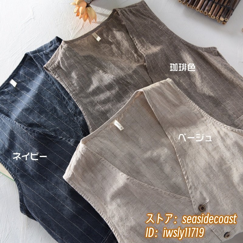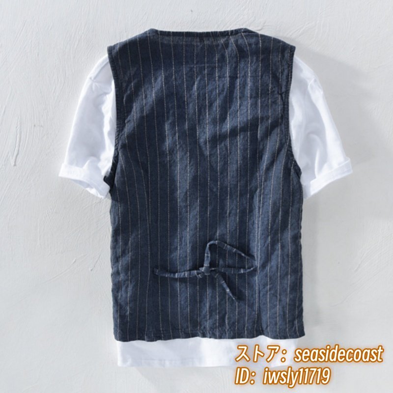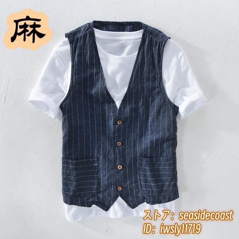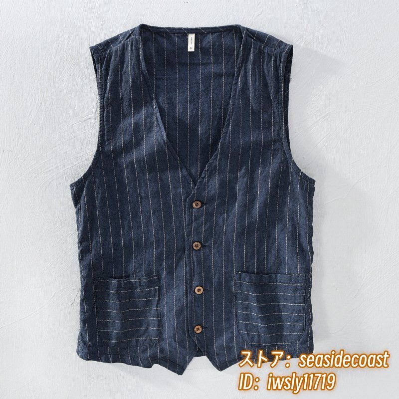 リネンベスト 春夏 ベスト 薄手 綿麻 ジレベスト 上質 ストライプ柄 Vネック ビジネス ヴィンテージ カジュアル 三色 スリム ネイビー 3XL