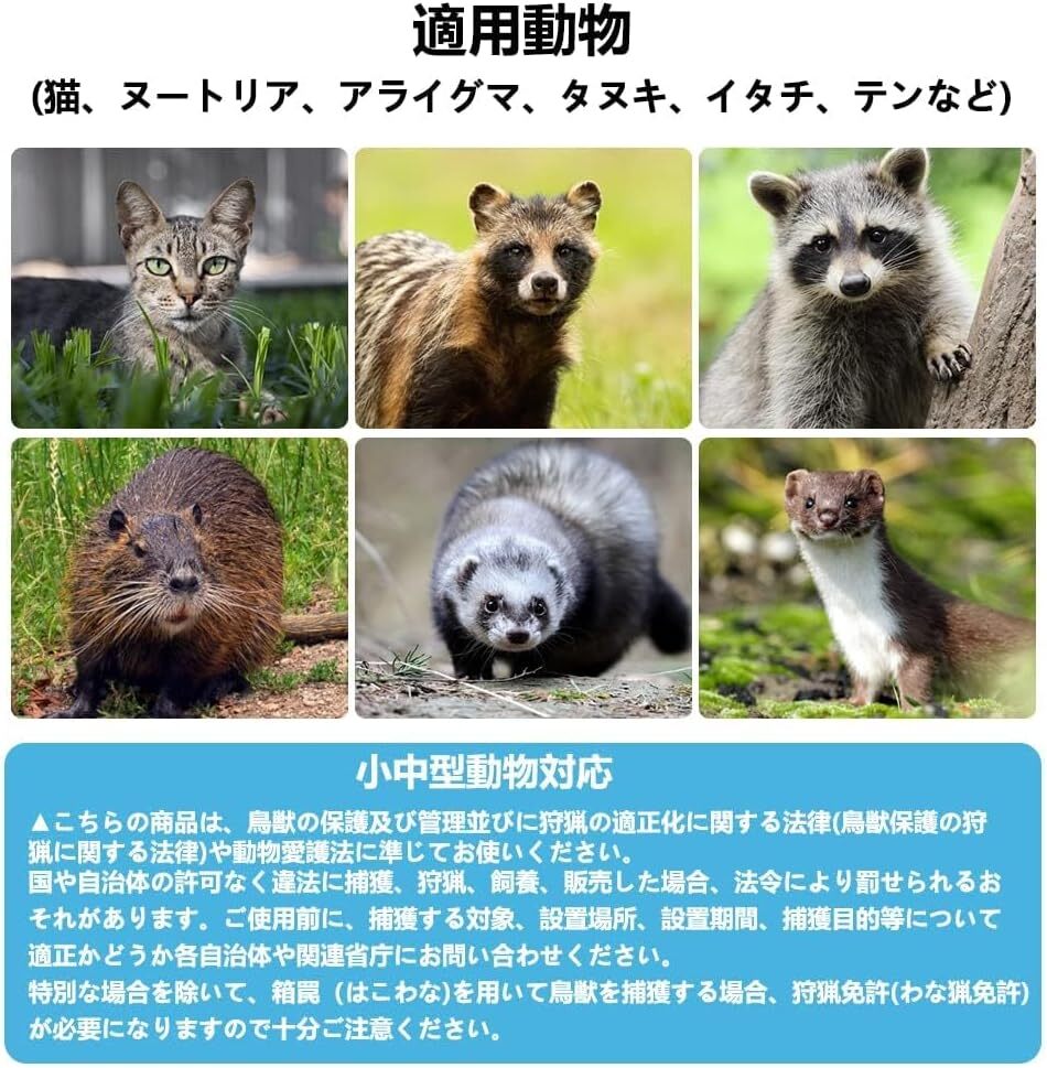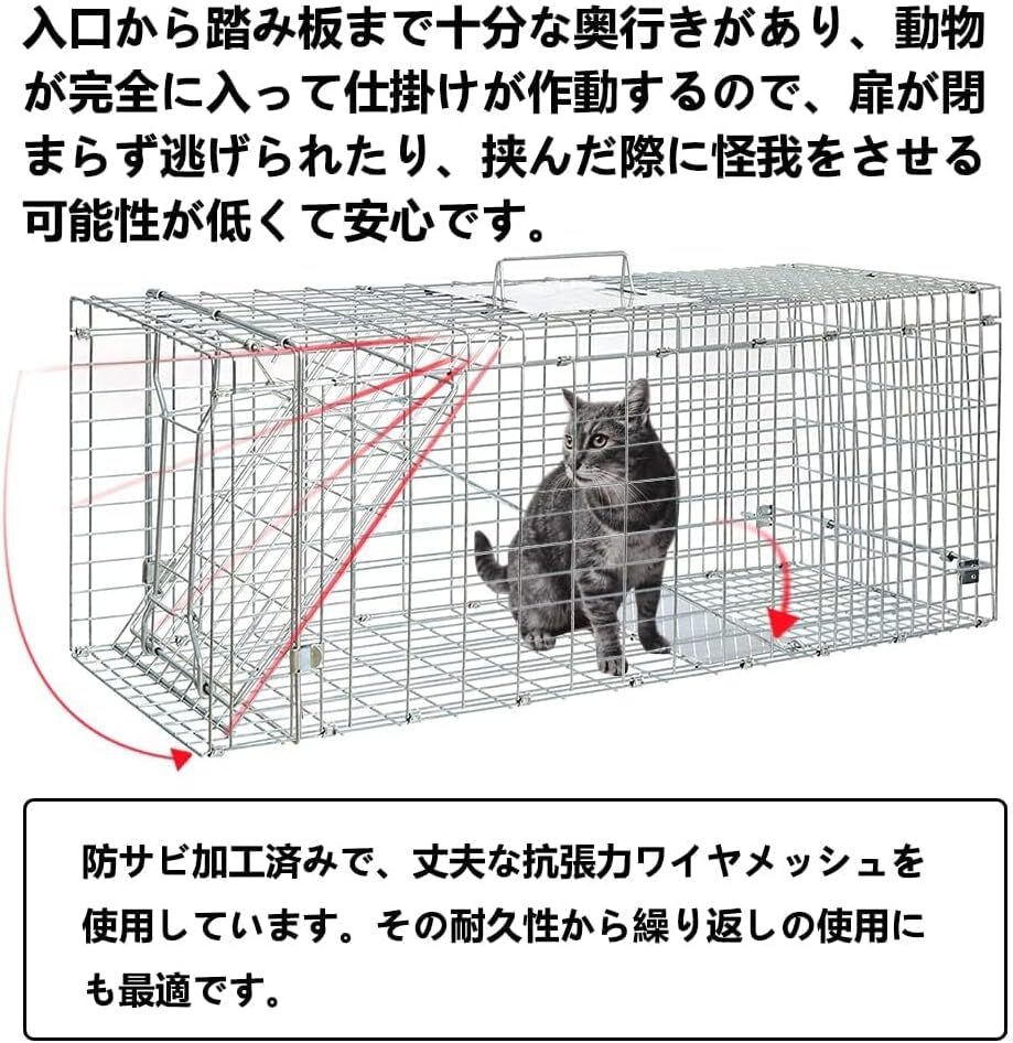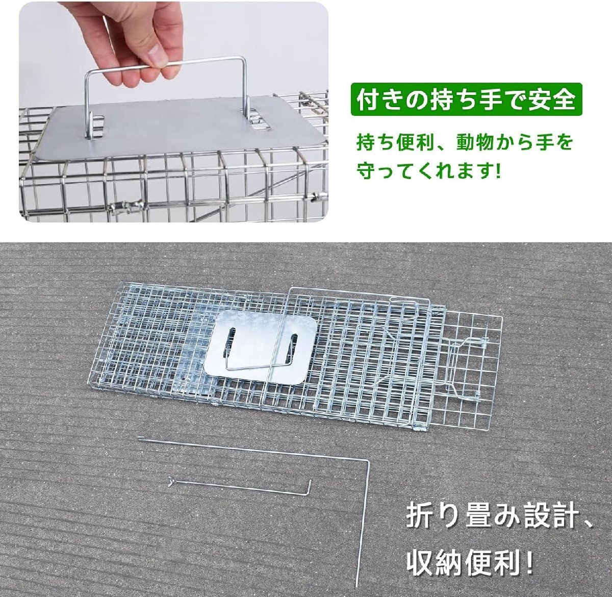 タヌキにぴったり Mサイズ H66cm×D23cm×H26cm 畑や庭に設置し、大切に育てた農作物や園芸植物などを動物から守ります。 ねずみやタヌキ、野良猫も捕獲できます。 また、ペットが迷子になった時の保護する道具としても可能。 餌に釣られた動物がプレートを踏めば内部に閉じ込められます。 使わない時はコンパクトに 使わない時は折りたたんで コンパクトになるので 収納場所にも困りません。 薬物や毒物は不使用 女性でも簡単に組み立てられる折りたたみ式 動物愛護法や鳥獣の保護及び管理並びに狩猟の適正化に関する法律 (※鳥獣保護ノ狩猟ニ関スル法律)に準じてお使い下さい。 〔商品詳細〕 本体サイズ:約H66cm×D23cm×H26cm 折りたたみ時:約H77cm×D23cm×H4.5cm 重量:約3kg 捕獲可能動物(参考):野良猫 アライグマ タヌキ ハクビシン イタチ ネズミ テン