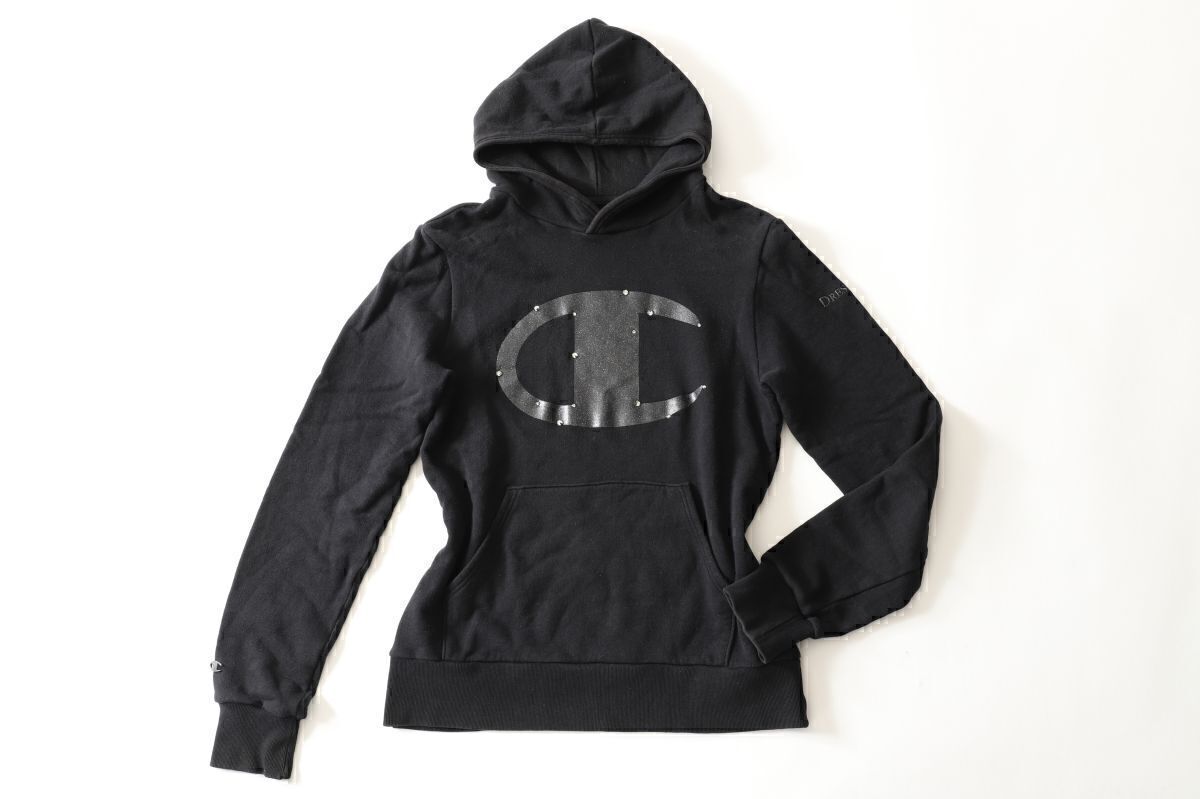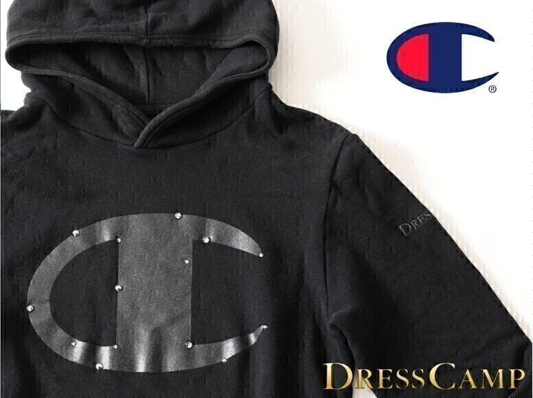 美品 DRESS CAMP ドレスキャンプ別注 Championチャンピオン★クリスタルビッグロゴプルオーバーフーディー Size46 M【C-200912】ブラック黒