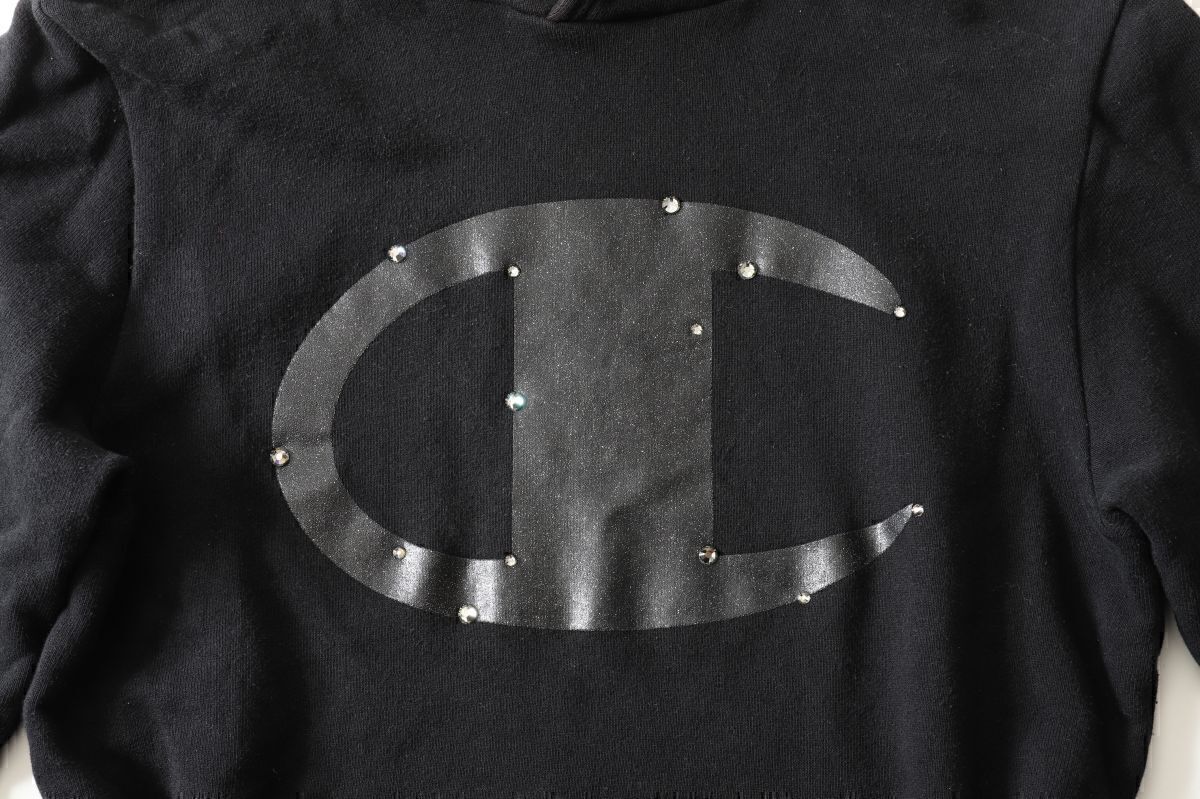 商品説明:DressCamp別注のプルオーバーフーディー。ロゴにラインストーンが付いたゴージャスなデザイン。