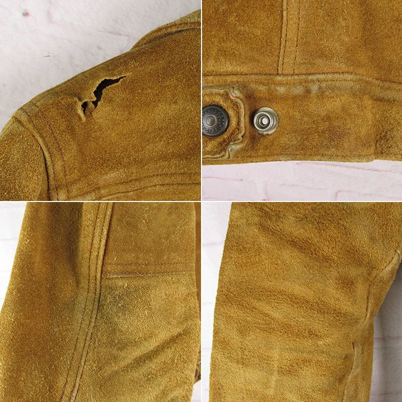 商品詳細 | ■ブランド : Levi's ■素材:スエード ■カラー : ブラウン系 ※色に関してはこの商品の出品者の主観で判断しております。カタログや正規のカラーとは言い回しが異なる場合があります。 ■商品の詳細 ・タブがカットされています。 ・後面の左肩に3cmほどの破れが見られます。 ・襟首や袖口、裾に色あせやくすみが見られます。 ・胸や袖に細かな擦れが見られます。 291111S |