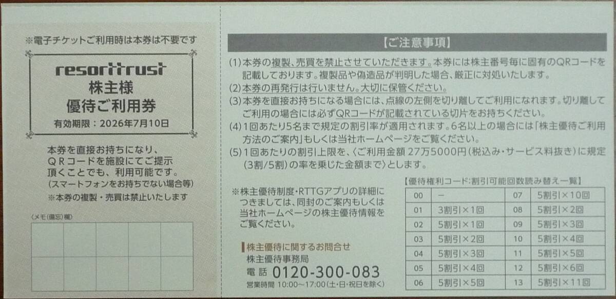 | ■リゾートトラスト㈱の株主優待券(3割引×1回)1枚です。 |