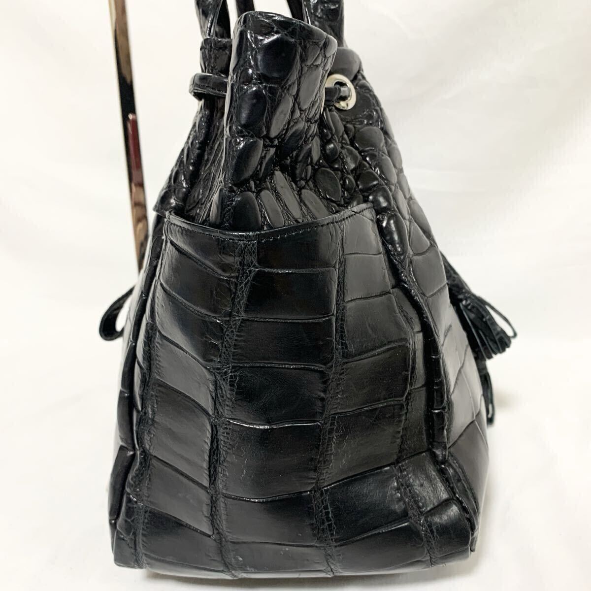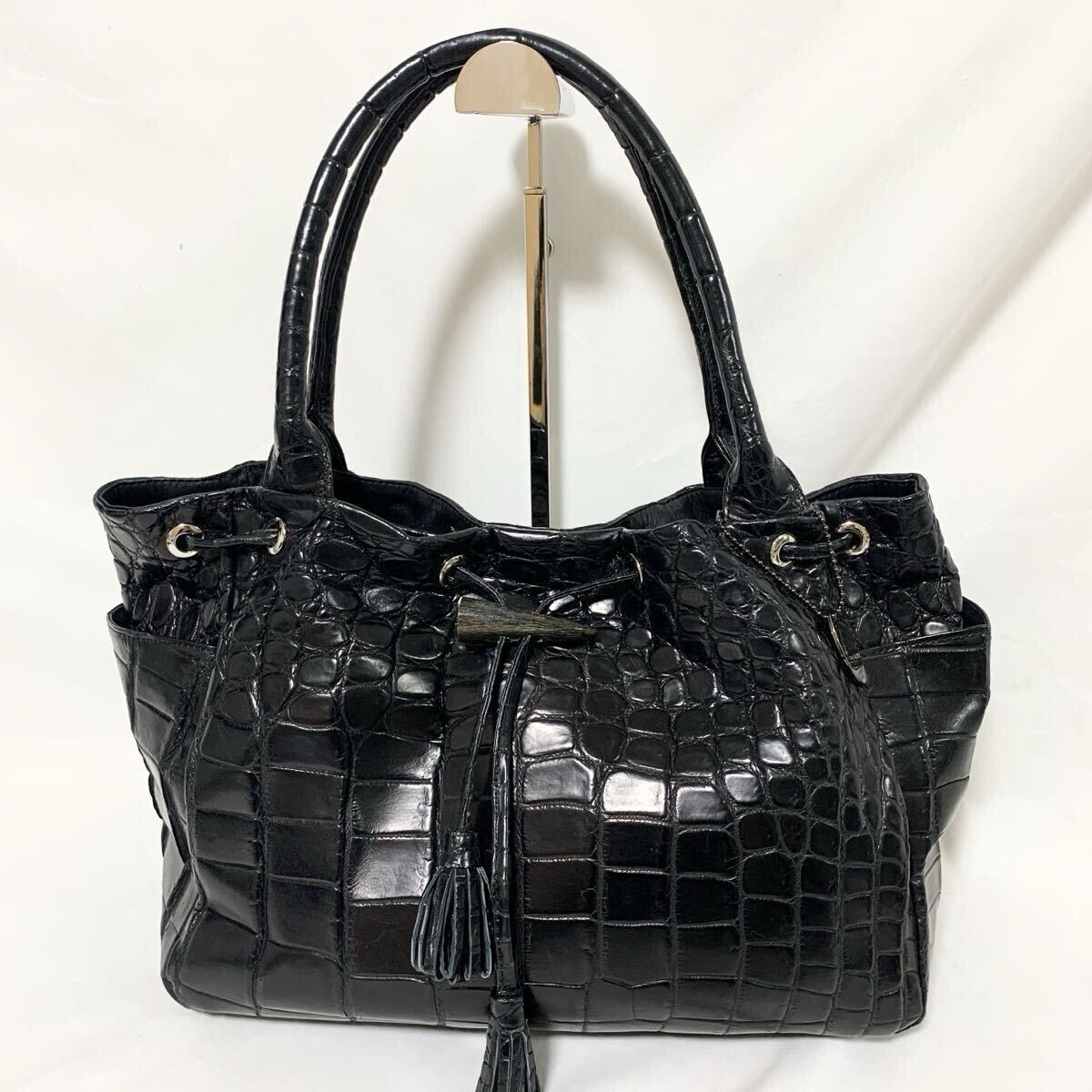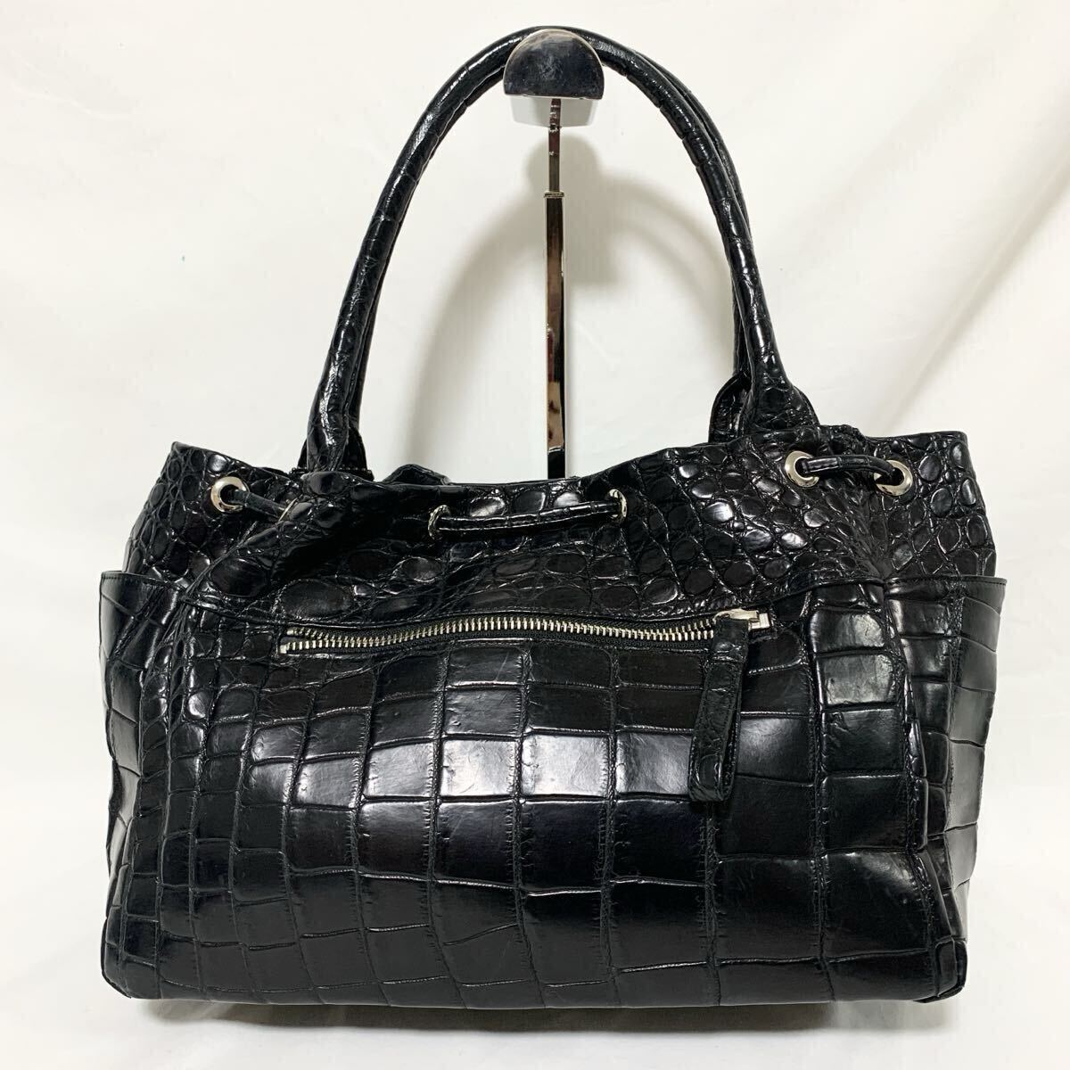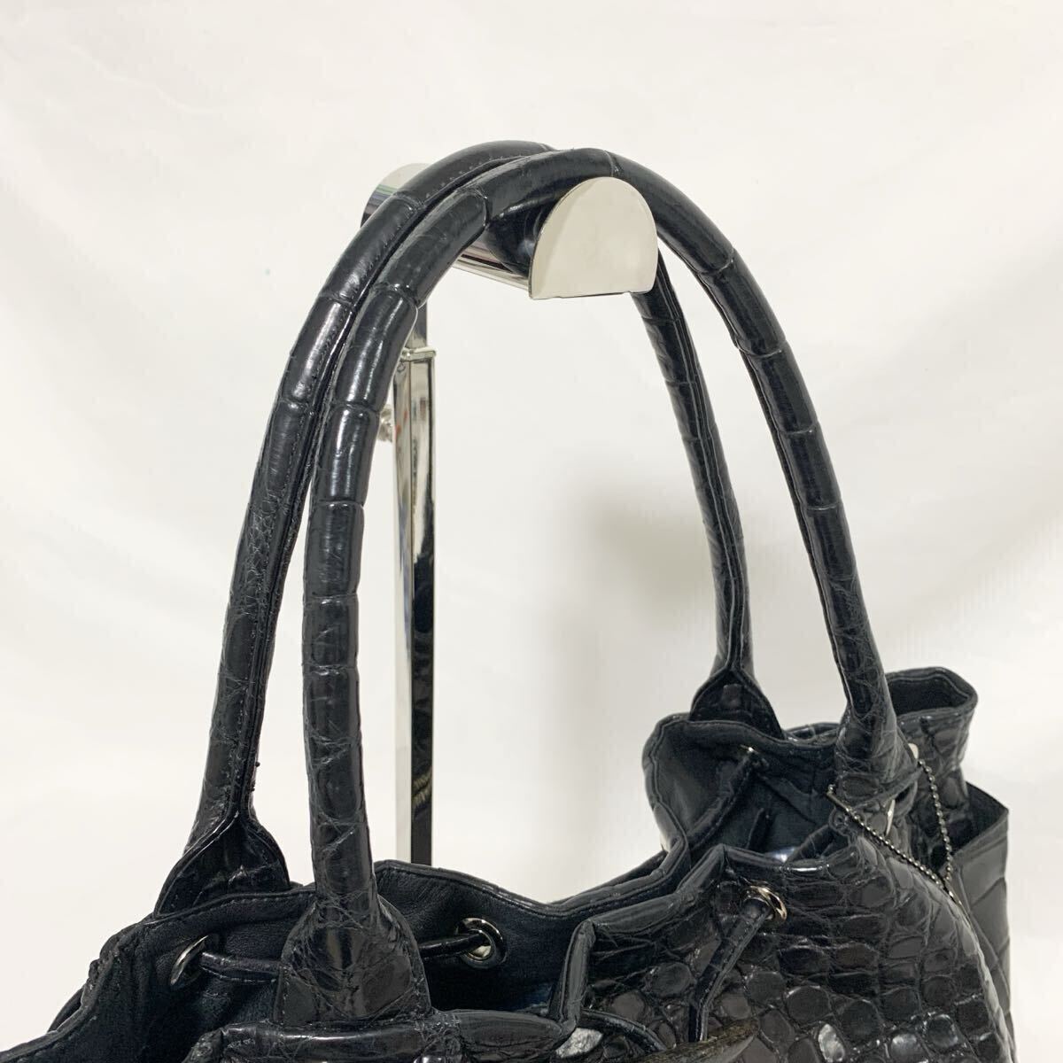 1円 マットクロコダイル トートバッグ ハンド ブラック 黒 シルバー金具 エキゾチックレザー レディース ワニ本革 巾着 センター取り肩掛け