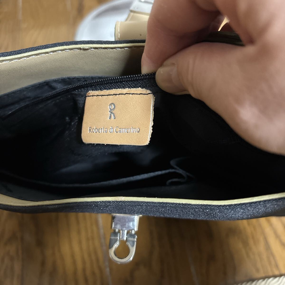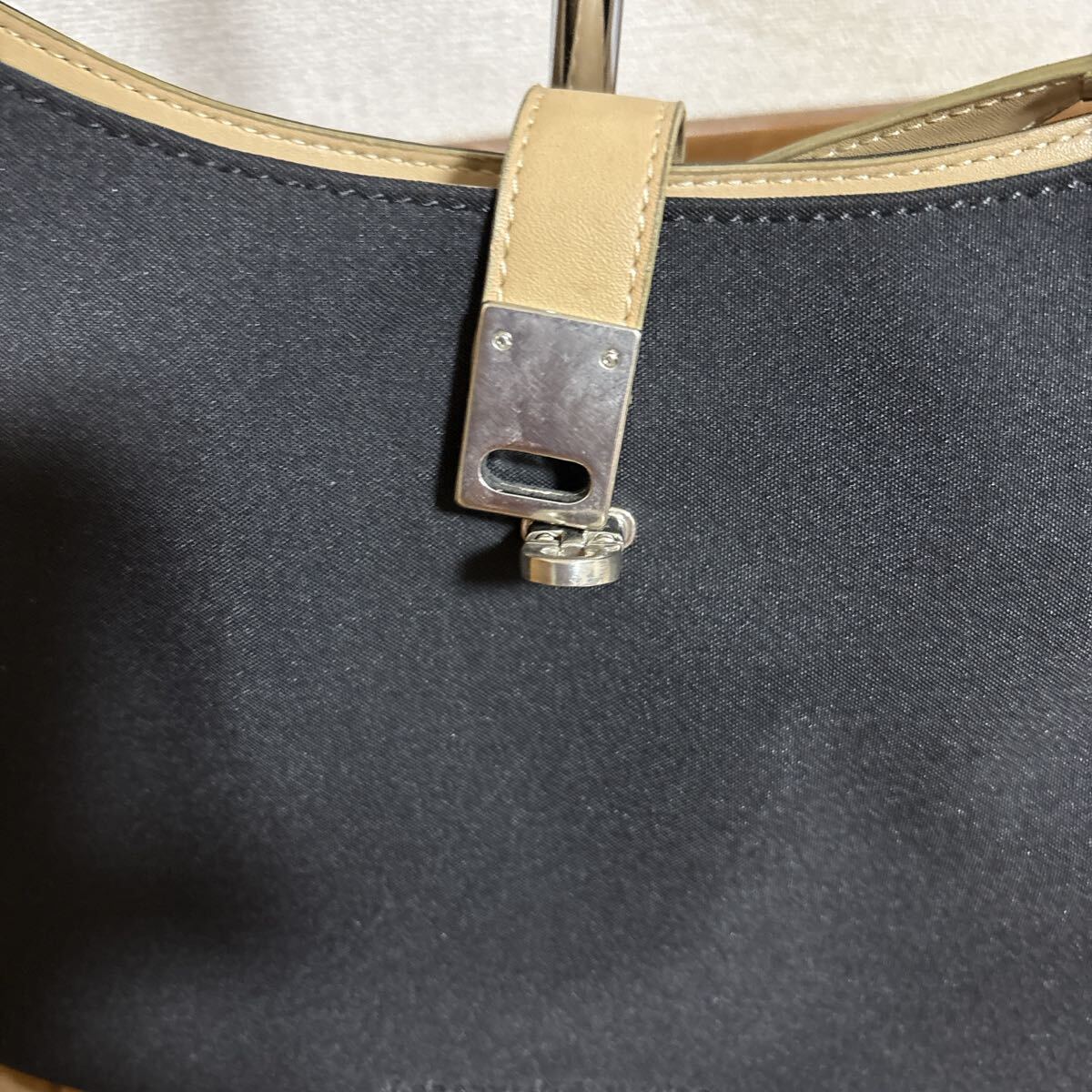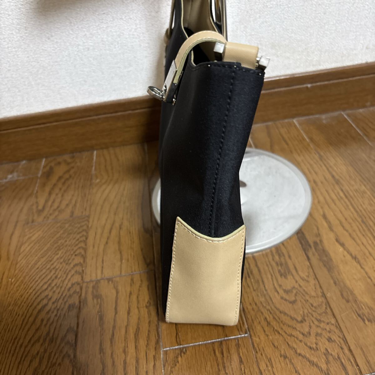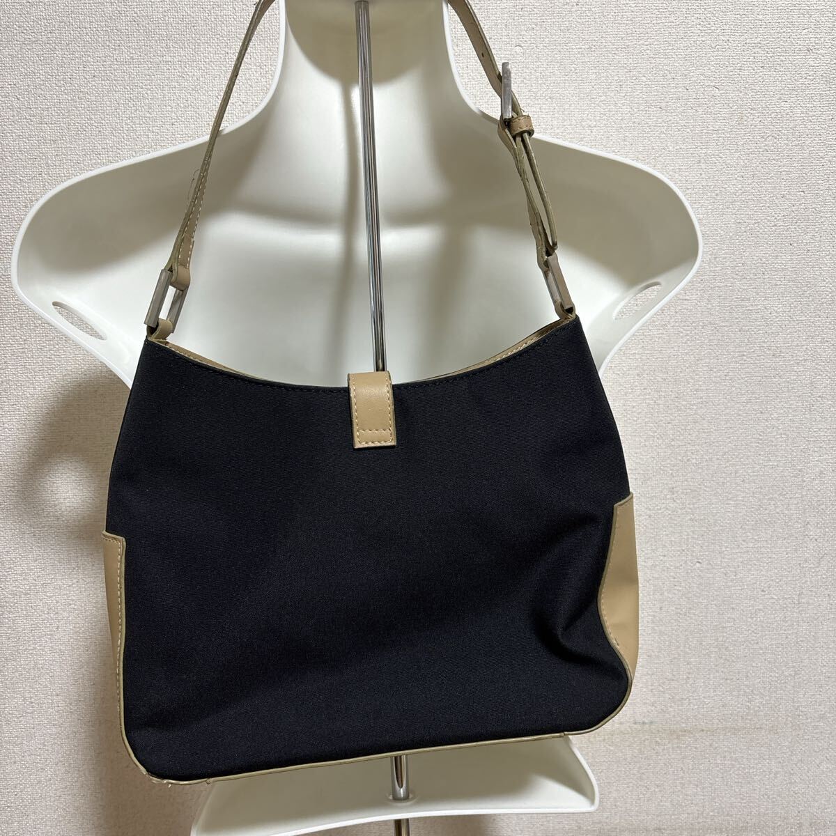 シンプルで洗練されたデザインの黒とベージュのショルダーバッグ。