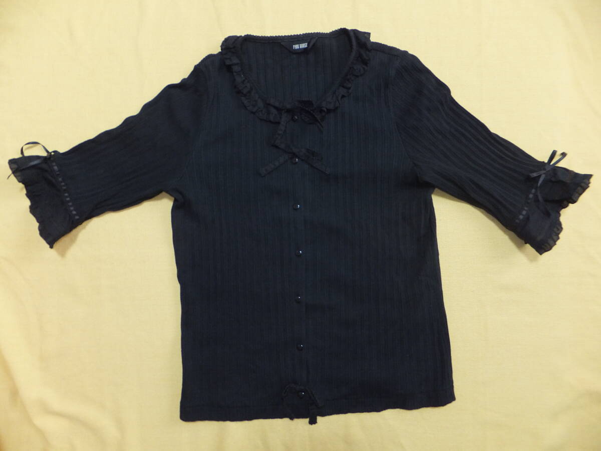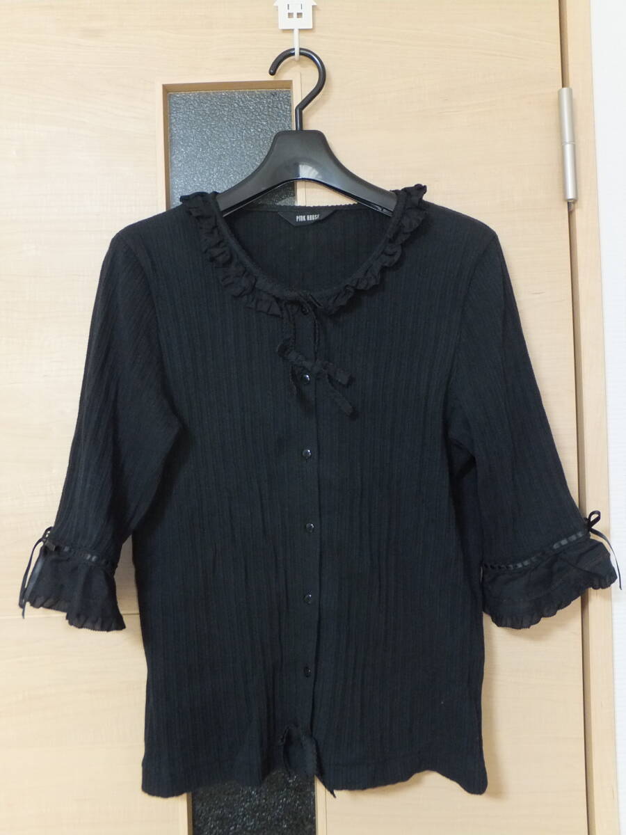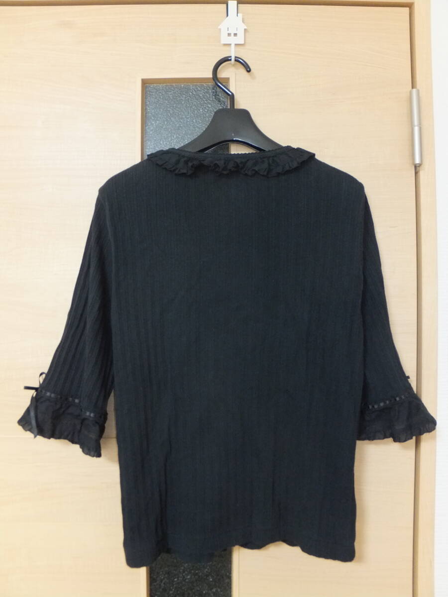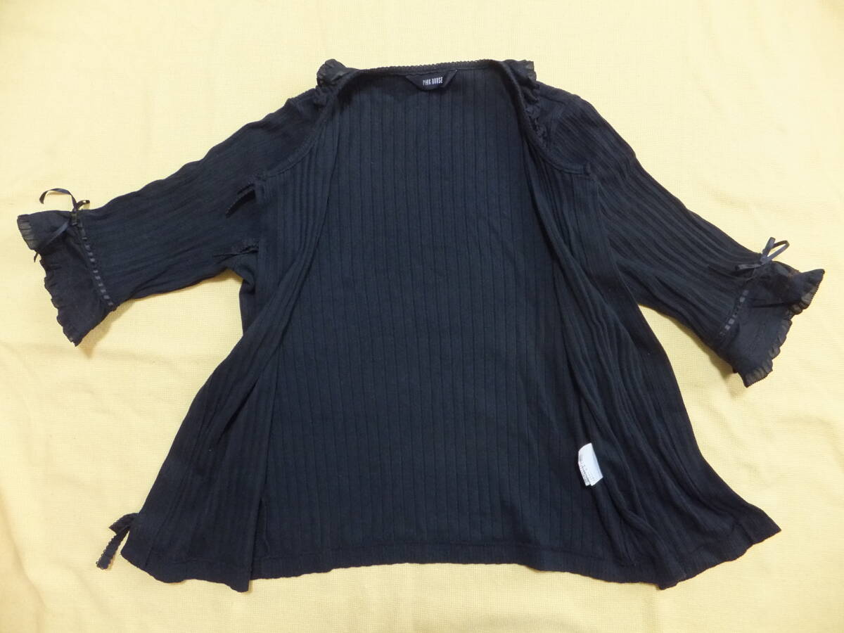 中古 PINK HOUSE ピンクハウス ブラック 黒 リブ 5分袖 前開き カーディガン トップス フリル リボン 伸縮性 日本製 ジェディックス 花型ボタン (15)