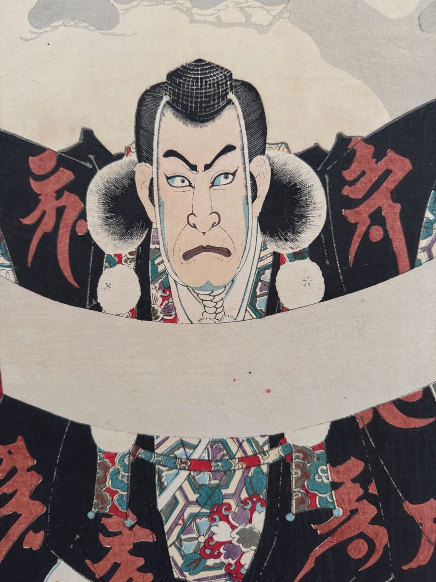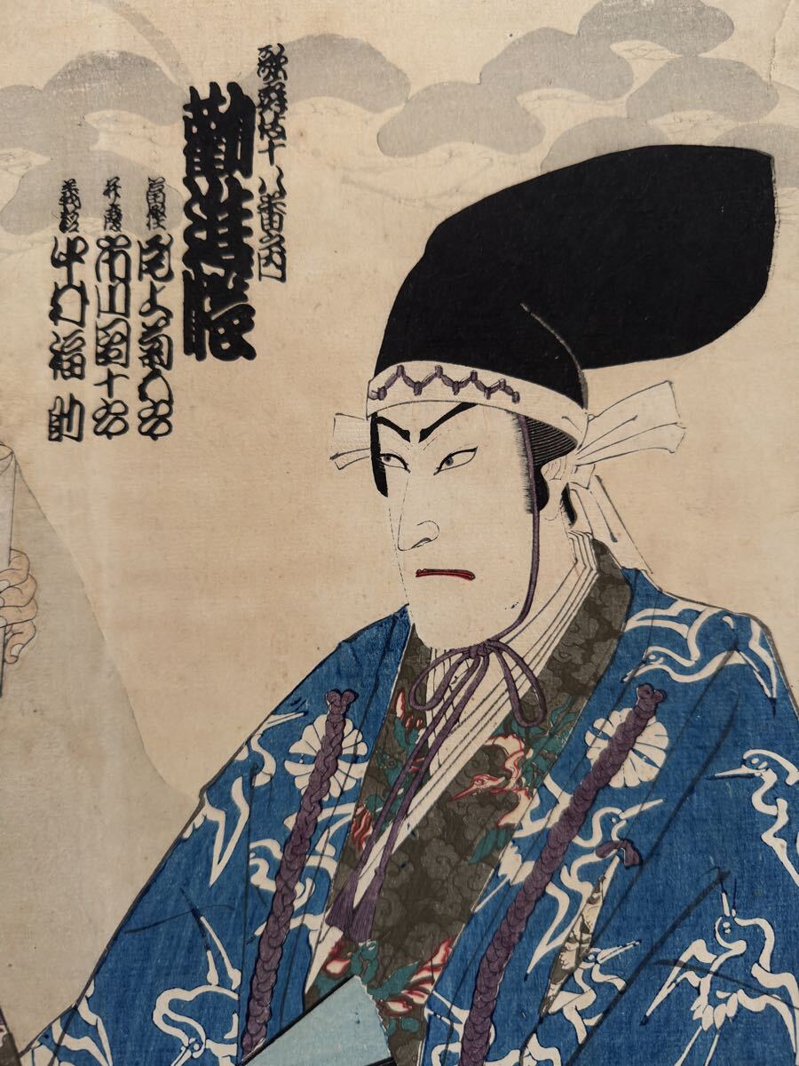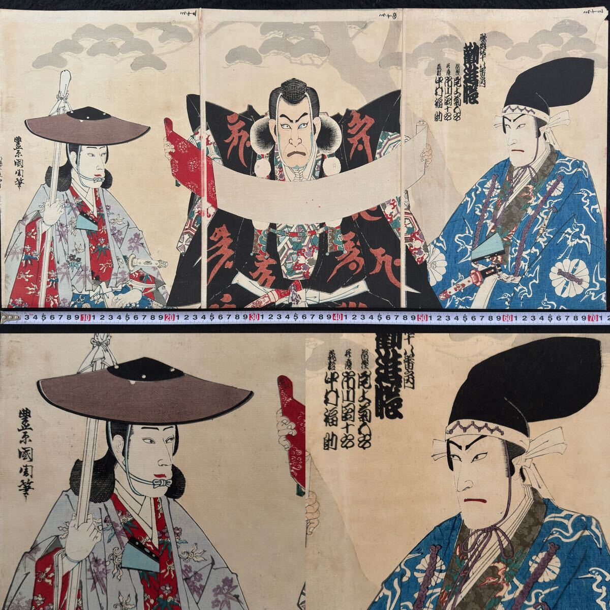 明治期/真作 豊原国周「歌舞伎十八番之内 勸進帳」本物浮世絵木版画 役者絵 歌舞伎絵 芝居絵 錦絵 大判 三枚続き 裏打ち