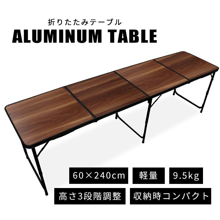広々サイズの240cm×60cm!! サビに強いアルミを使用! 天板には防水加工が施されています。 必要のない時は折りたたんで収納できる!! 取っ手付きで持ち運びもラクラク♪ 高さは「ハイスタイル」「ロースタイル」の2段階調節。 付属の脚ジョイントを使用する場合はハイスタイルとして、 脚ジョイントを使用しない場合はロースタイルとして、 使用することができます。 お好みや用途に合わせて使い分けることができる嬉しい仕様♪ キャンプ、バーベキュー、お花見などにとても便利! 【商品仕様】 ・折りたたみ式 ・カラー:ダークウォルナット ・使用時サイズ(約):縦60cm×横240cm×高さ70cm/40cm ・収納時サイズ(約):縦64cm×横63cm×幅16.5cm ・重量(約):8.5kg ・材質:アルミフレーム、スチール、合板 |