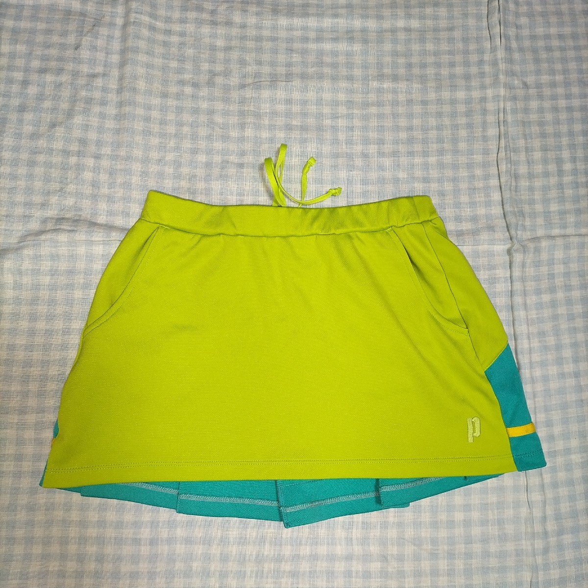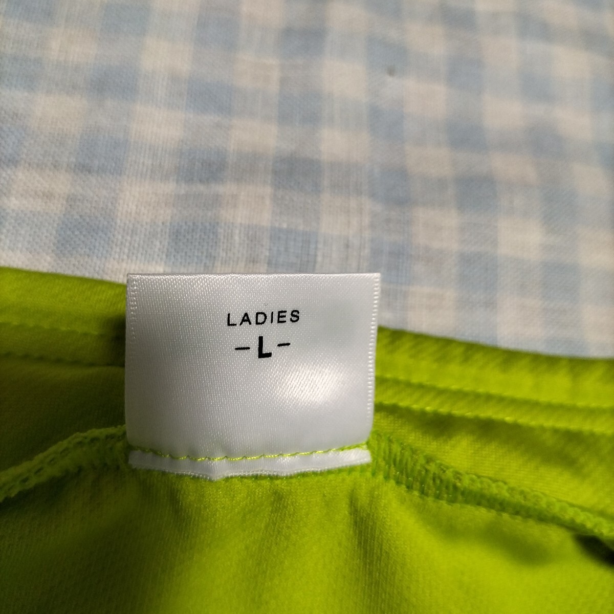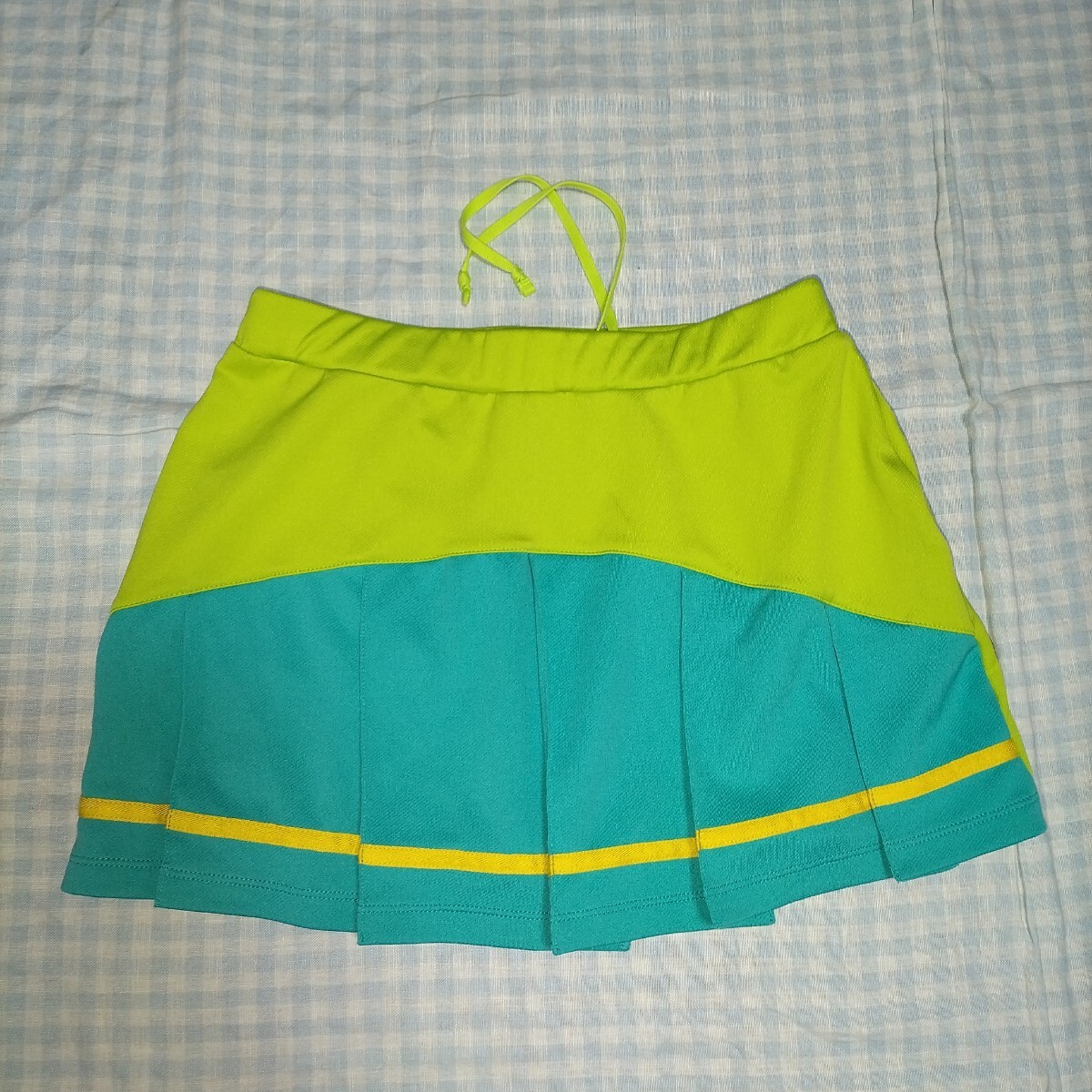 色は黄緑、水色、うすオレンジ色のライン 素材はポリエステル100% サイズL 平置き実寸:ウエスト33cm着丈前31cm後ろ33cm