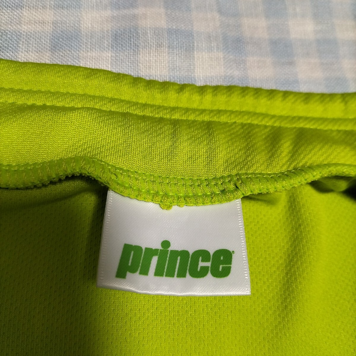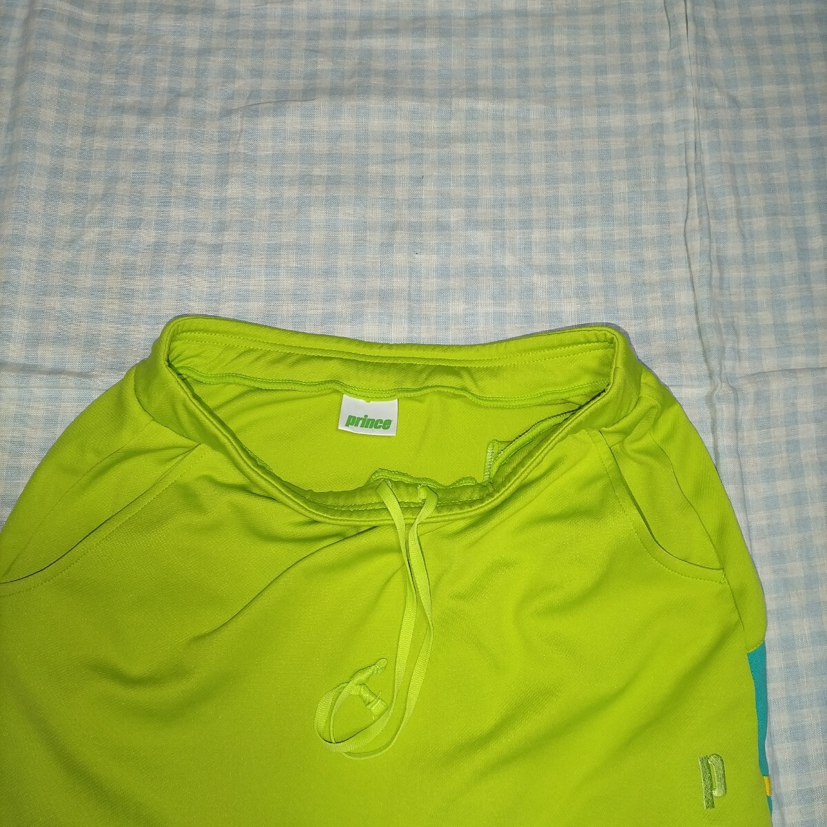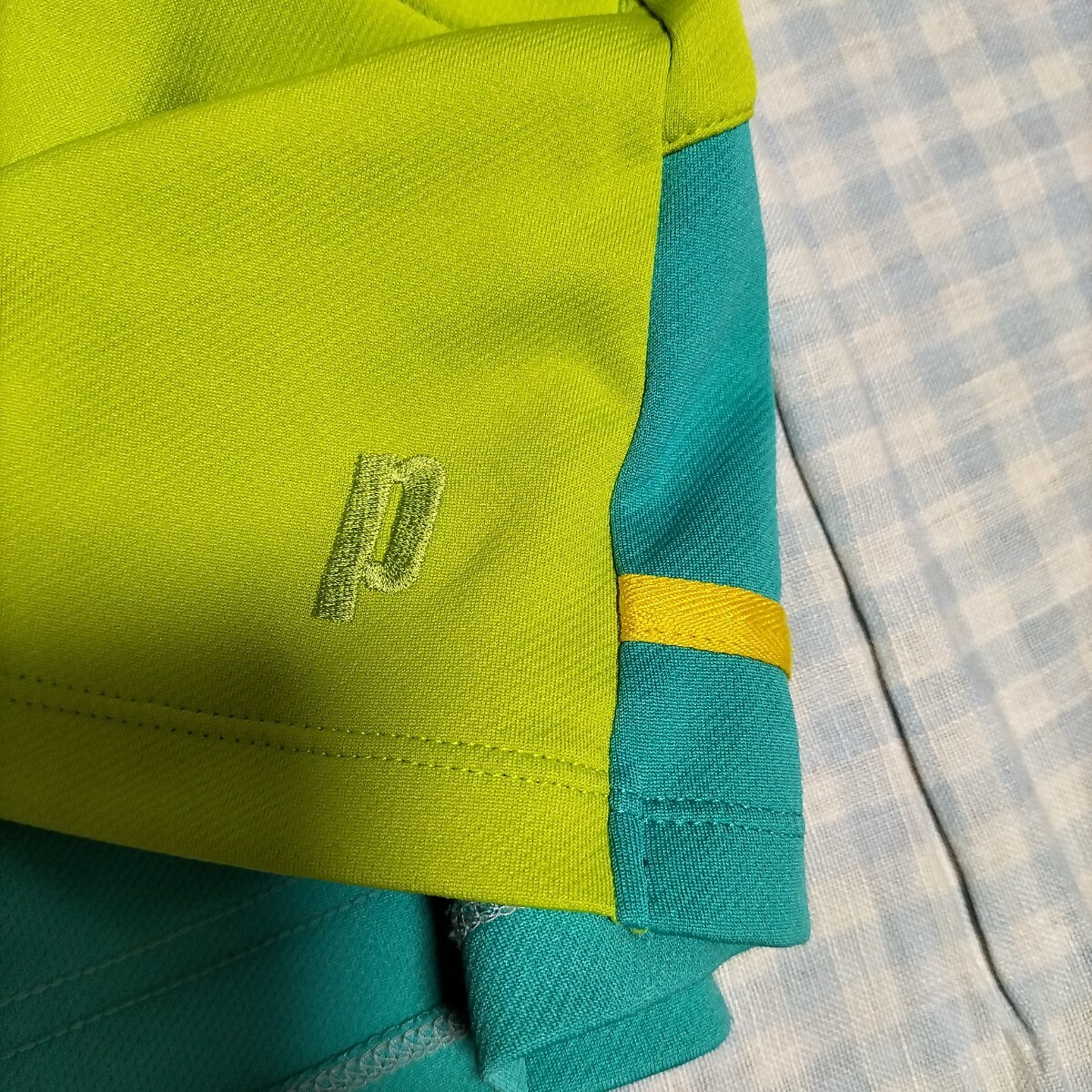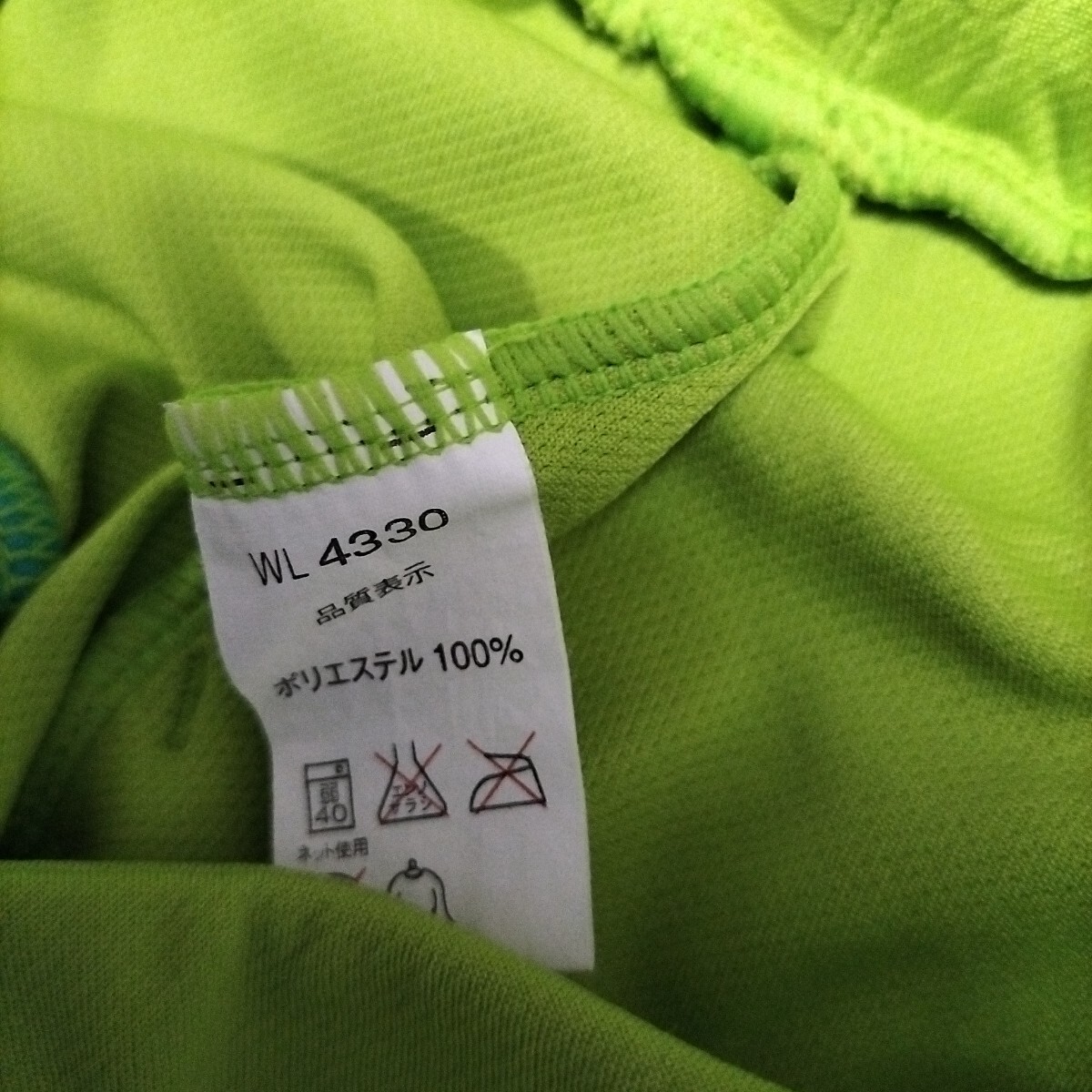 色は黄緑、水色、うすオレンジ色のライン 素材はポリエステル100% サイズL 平置き実寸:ウエスト33cm着丈前31cm後ろ33cm