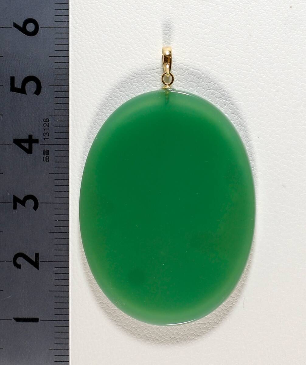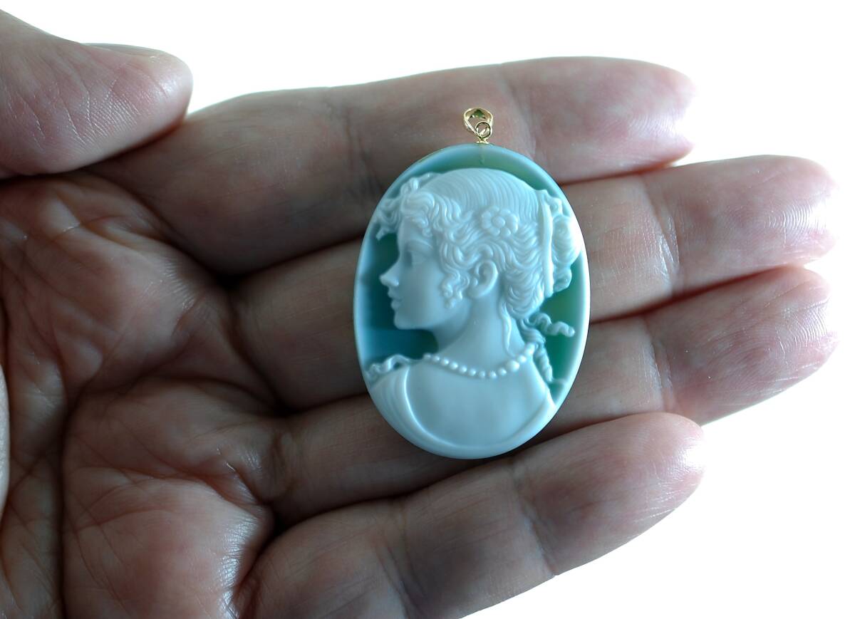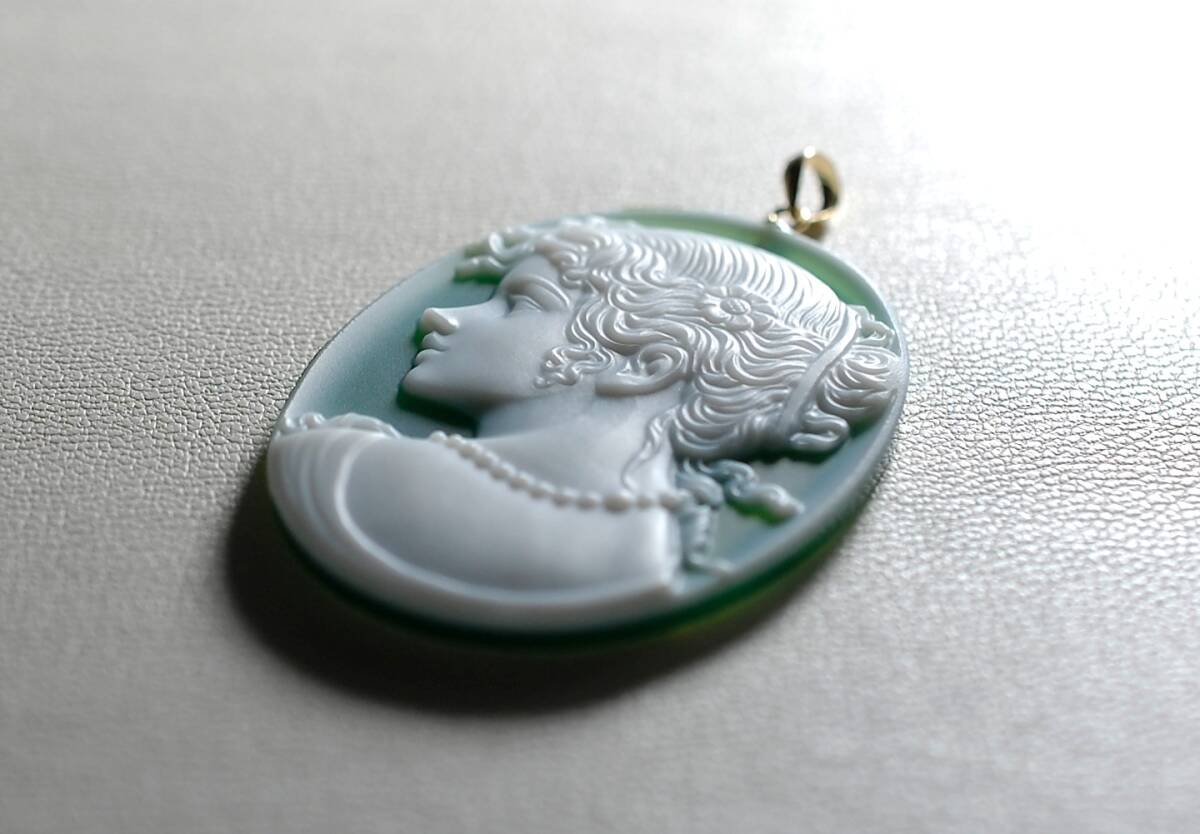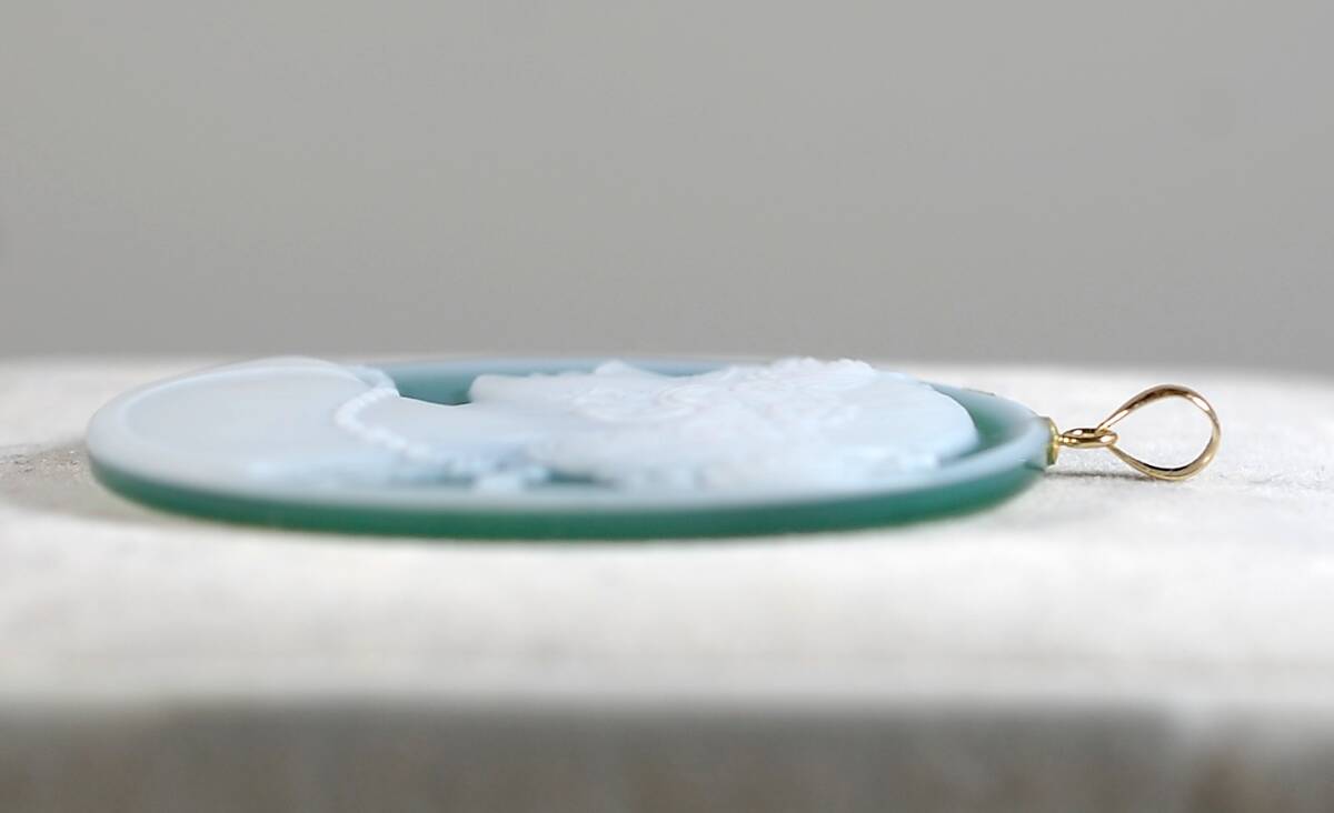 ¥100~K18繊細な描写彫り美しい!天然カルセドニーカメオ30.94ct 40.0×30.0㍉全長46.5㍉PT