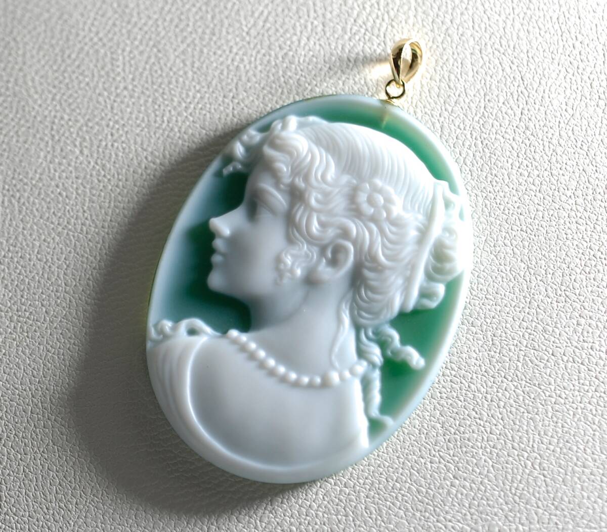 100K18繊細な描写彫り美しい!天然カルセドニーカメオ30.94ct 40.0×30.0㍉全長46.5PT