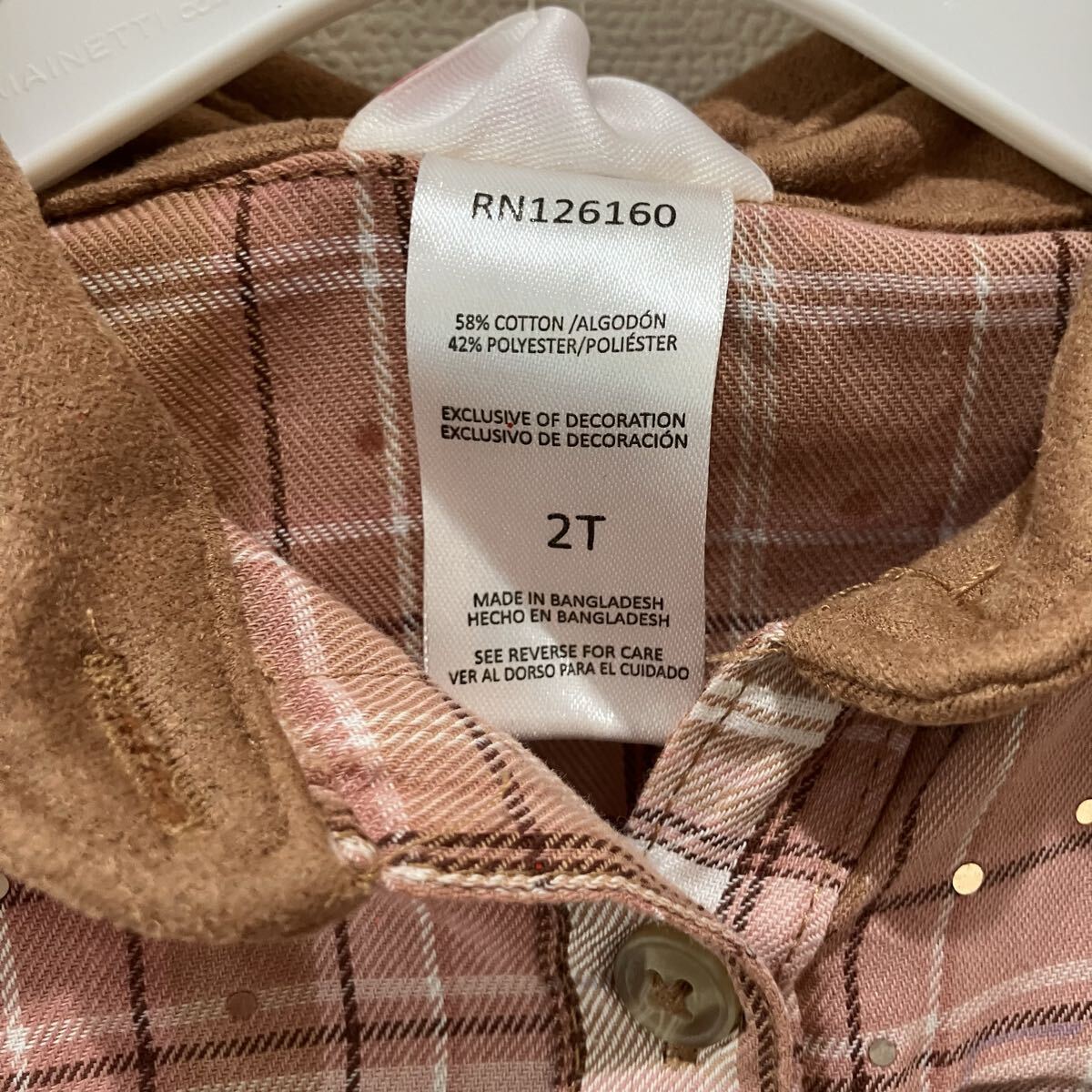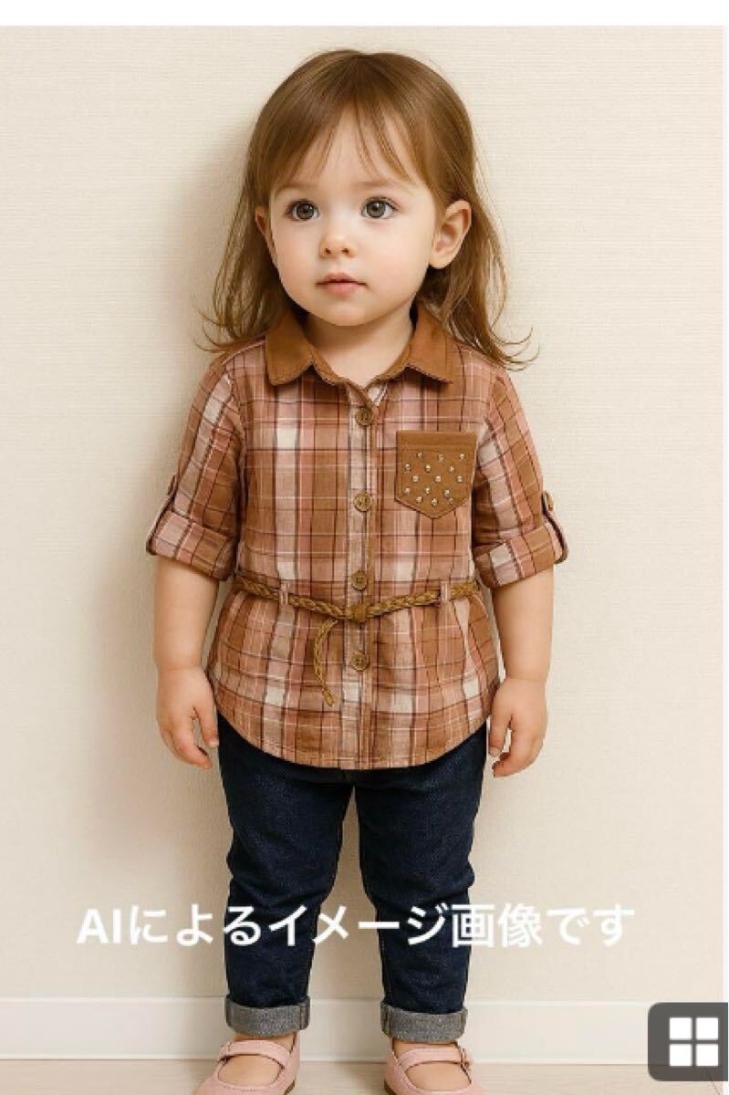チェック柄シャツとパンツのセットアップで、カジュアルながら可愛らしいデザインです。