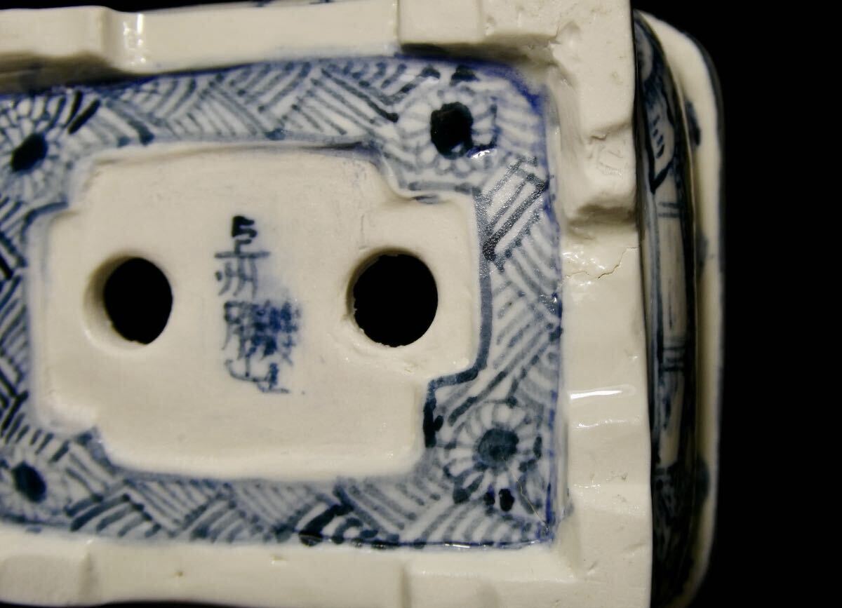 ■ 商品詳細【上州勝山 染付山水舟図外縁段脚長方鉢 size 9.1×7.2×3.4㎝ 未使用品 共布付 Japanese Bonsai-hachi WABI SABI 】