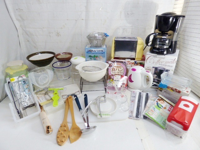 こちらは140サイズでの発送を予定しております。 送料など詳細は「梱包・発送について」欄に記載しておりますので、そちらをご確認ください。 キッチン用品をいろいろまとめて出品です。 ・保存容器 ・すり鉢 ・ポップアップトースター ・コーヒーメーカー ・電気ケトル ・チョッパー ・おたま など、詳細は写真でご確認ください。 写真のものがすべてです(キッチン用品以外のものはイメージのため、付属しません) こちらは未使用品と中古品が混在しています。 電気製品は、簡易ですが、出品時に動作確認済みです。 家庭での保管品となりますので、傷や汚れなど、写真をご確認の上での入札をお願いいたします。 <電気製品について> 動作、通電確認品であっても、電気製品等は新品中古問わず内外装部品の損耗や劣化、回路、接触の不良など予測出来ません。 特に古い物などは配送中の衝撃などにより破損する場合もありますので通電、動作確認品は出品時の確認ができた物でこれを保証するものではございません。 いかなる理由であっても返金や返品はいたしかねます。電気店などで新品を購入する感覚で入札しないでください。上記のようなリスクがある物として入札下さい。 リスク軽減のため安く出品する様にしています。 詳細複数写真 ← Googleフォト リンク出来る場合写真はGoogleフォト 動画はYouTubeにリンクしています ※梱包について※ 緩衝材を使用した梱包をご希望の場合は60~100サイズまで100円、120~170サイズまで300円を頂戴いたします。 落札時にご希望の旨を必ずご連絡下さい。ご連絡がない場合は簡易梱包で発送致します。 簡易梱包の場合、追加費用はかかりません。 ※簡易梱包は緩衝材等を使用しませんのでご了承下さい。 素人なりに配慮した梱包を心掛けております。 しかしながら配送中にどうしても欠け、ひび、割れ等発生する場合がございますが免責とさせて頂き、返金等は致しかねますのでご了承・ご了解の上ご入札下さい。 詳しくは梱包・発送についてをご確認下さい。 商品ランク(ランクの記載のない商品もございます) A:新品・未使用品。 B:未使用に近い状態です。 C:中古品ですが目立った傷や汚れありません。 D:中古品の為、やや傷や汚があります。 E:中古品の為、傷や汚れ等の使用感が多数あります。 F:全体的に状態が悪い。 ☆個人での主観評価となりますので参考程度にしてください。 | ||||||||||||||||||||||||||||||||||||||||||||||||||||||||