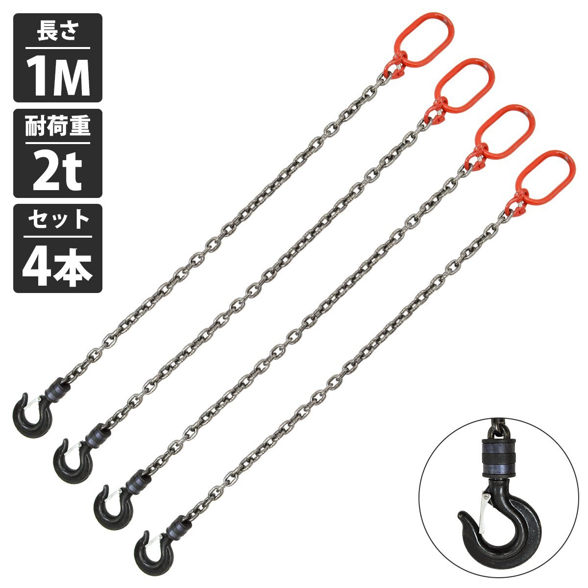 【送料無料】『4本セット 2t 1M』1本吊り チェーンスリング 吊り スリング チェーン 回転フックタイプ リンツ付き 径8mm 長さ 1m 耐荷重