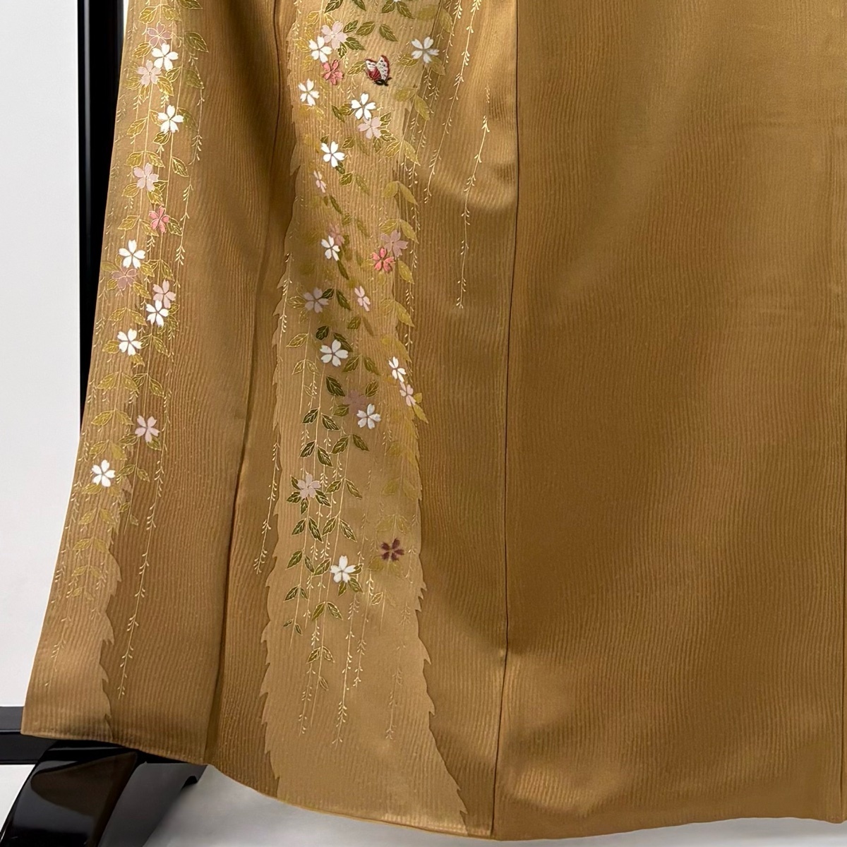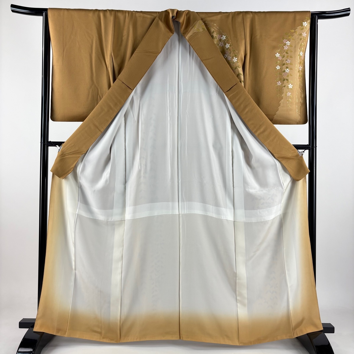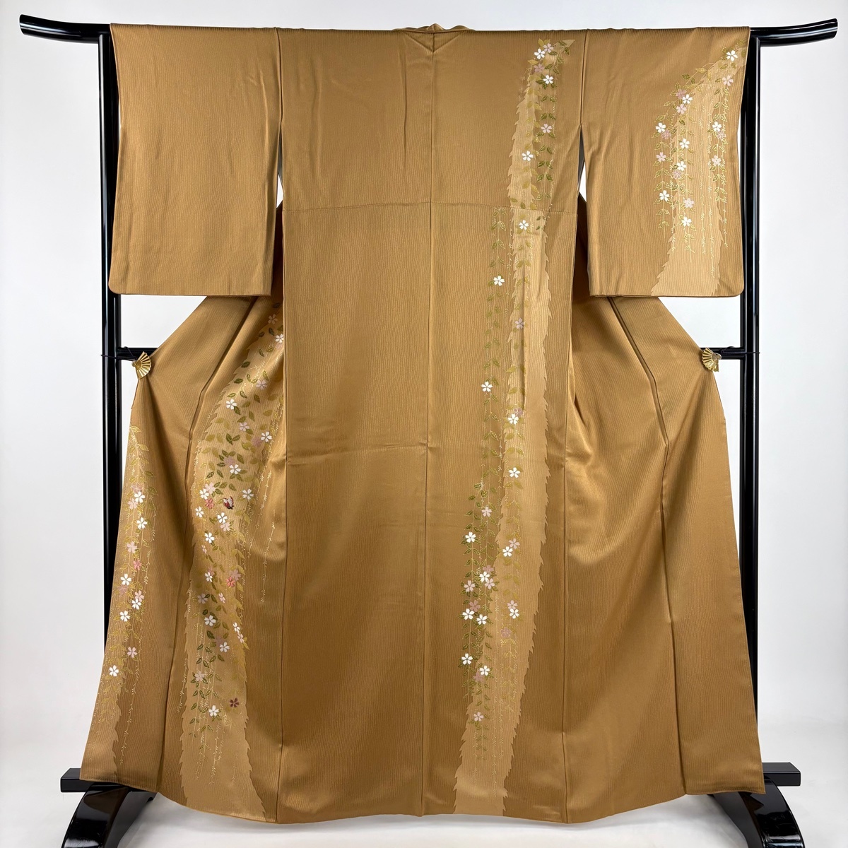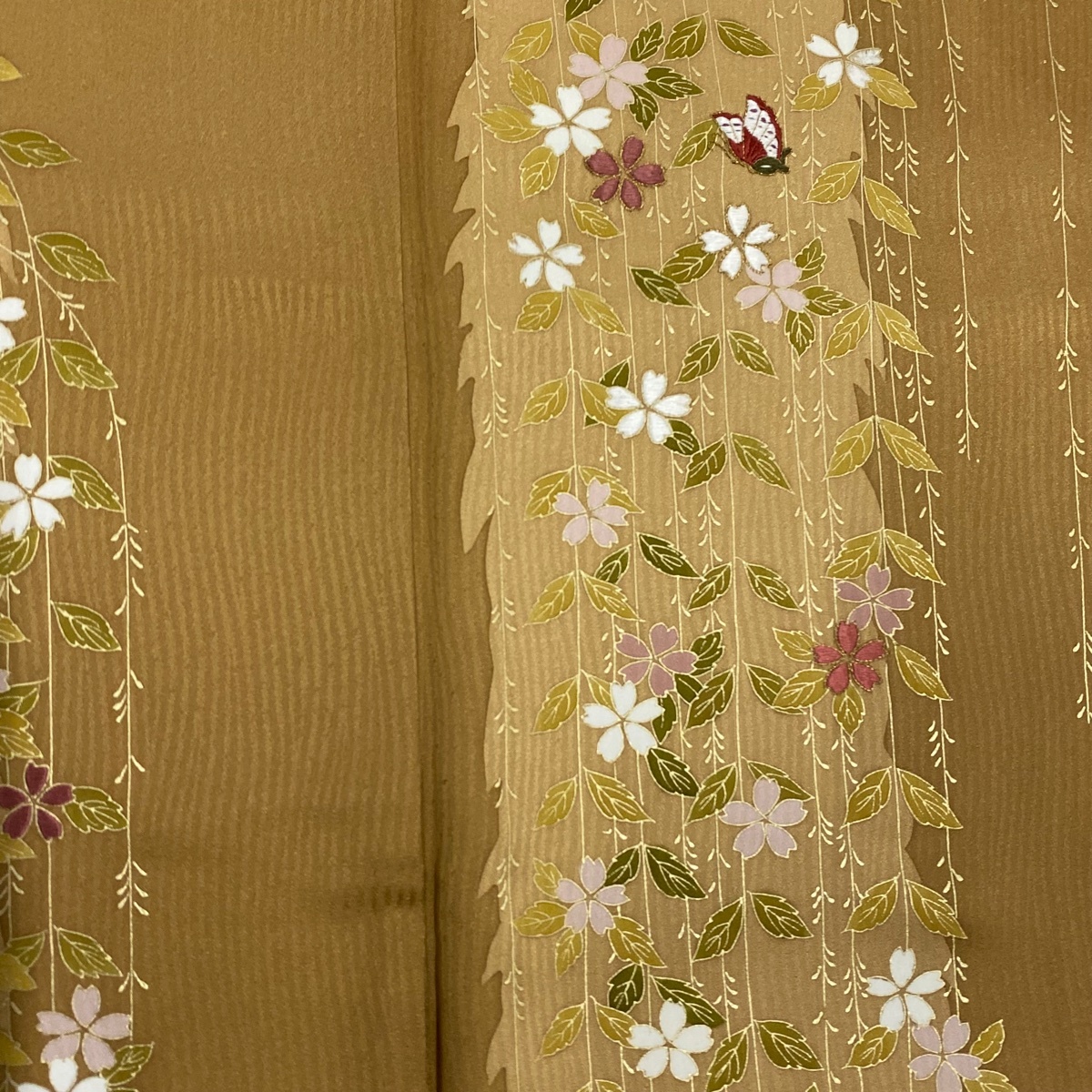 | 訪問着 美品 秀品 枝垂れ桜 蝶 金糸 刺繍 黄土色 袷 身丈163 裄丈63 S 正絹 【中古】 |