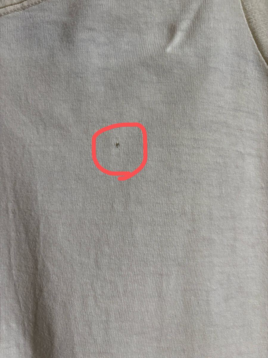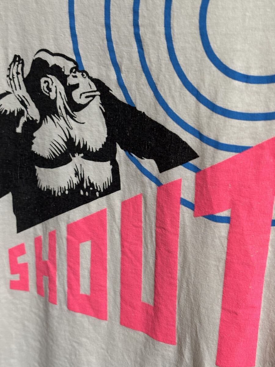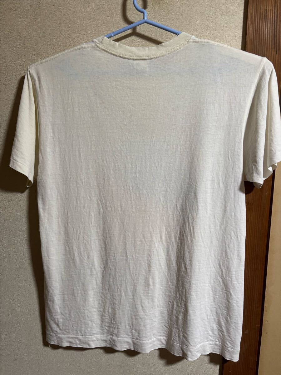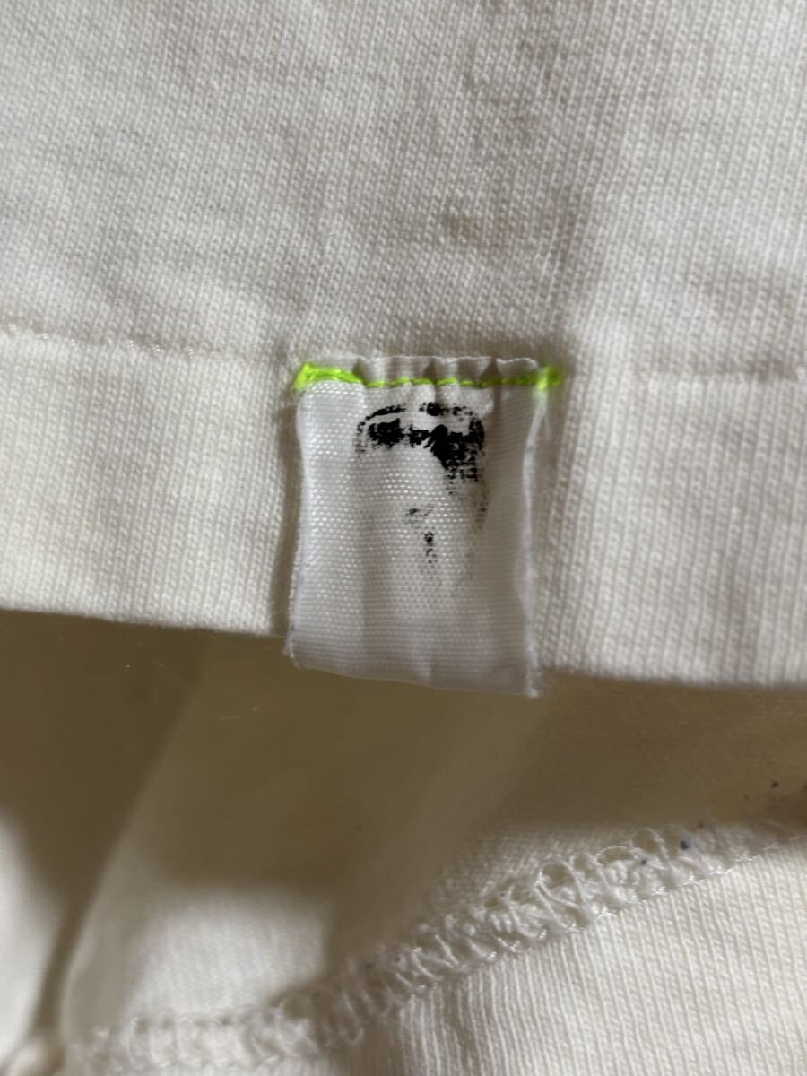 スケシンデザインのTシャツだったと思います。フランケンのピスネームはプリントが剥げています。首周りにダメージと右胸上部に1ミリ程度の穴(画像5枚目赤丸部分)が開いています。裁縫や刺繍の知識や経験のある方ならリペア出来ると思います。前面のプリントはひび割れがあります。古着特有の黄ばみが全体的にあります。